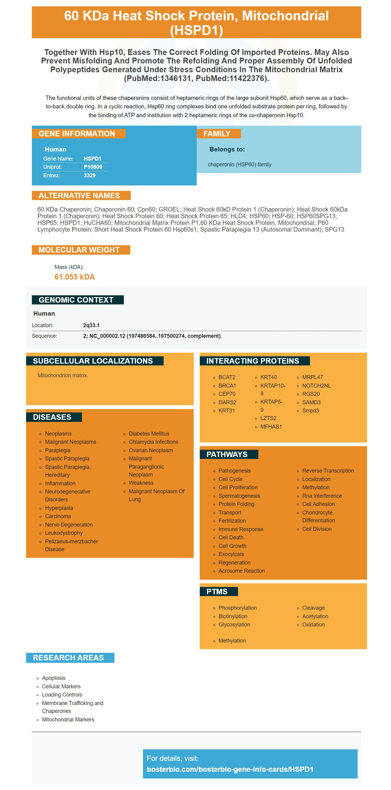 60 kDa chaperonin; Chaperonin 60; cpn60; GROEL; heat shock 60kD protein 1 (chaperonin); heat shock 60kDa protein 1 (chaperonin); Heat shock protein 60; heat shock protein 65; HLD4; HSP60; HSP-60; HSP60SPG13; HSP65; HSPD1; HuCHA60; Mitochondrial matrix protein P1,60 kDa heat shock protein, mitochondrial; P60 lymphocyte protein; short heat shock protein 60 Hsp60s1; spastic paraplegia 13 (autosomal dominant); SPG13