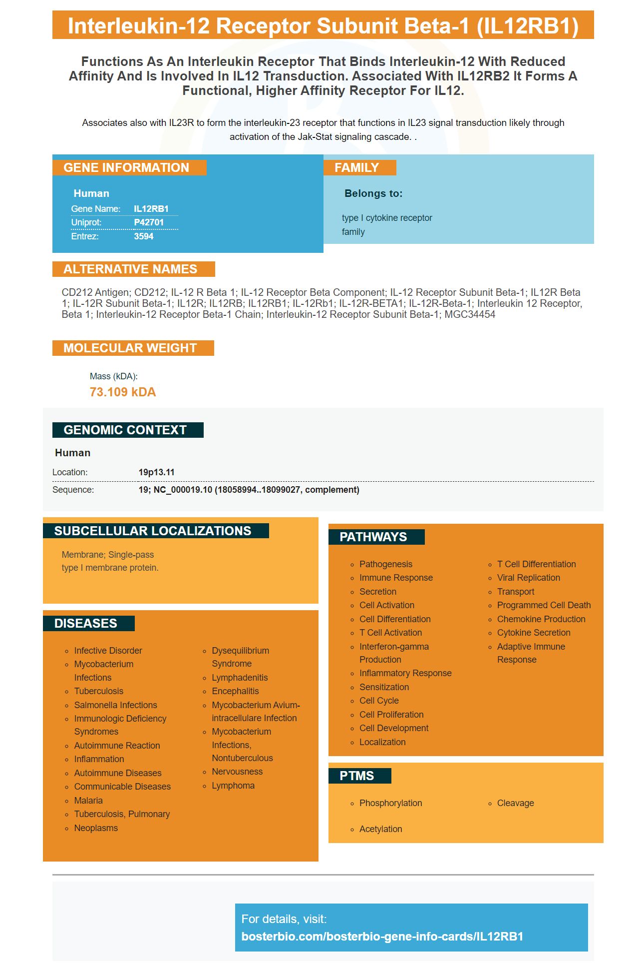 CD212 antigen; CD212; IL-12 R beta 1; IL-12 receptor beta component; IL-12 receptor subunit beta-1; IL12R beta 1; IL-12R subunit beta-1; IL12R; IL12RB; IL12RB1; IL-12Rb1; IL-12R-BETA1; IL-12R-beta-1; interleukin 12 receptor, beta 1; interleukin-12 receptor beta-1 chain; interleukin-12 receptor subunit beta-1; MGC34454