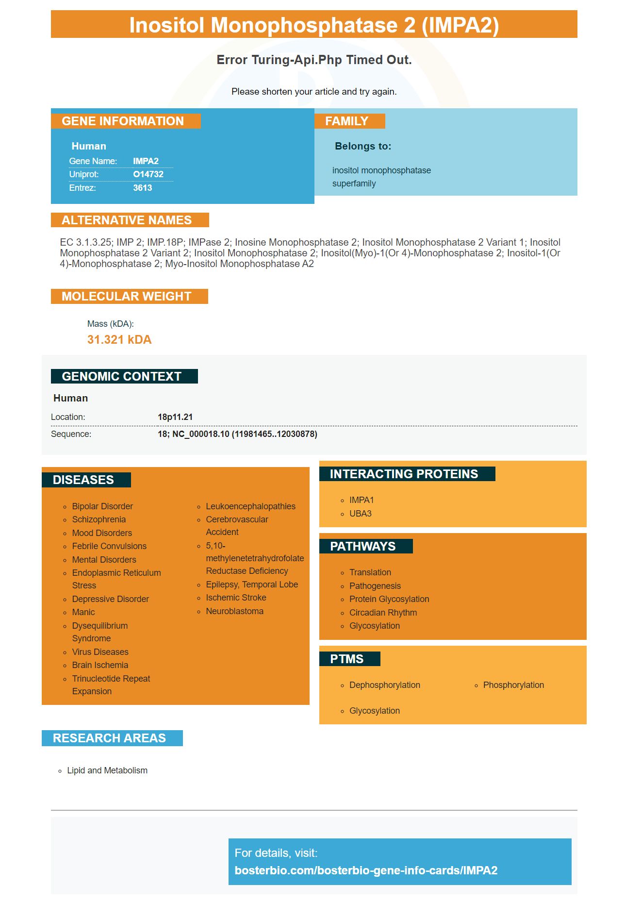 EC 3.1.3.25; IMP 2; IMP.18P; IMPase 2; inosine monophosphatase 2; inositol monophosphatase 2 variant 1; inositol monophosphatase 2 variant 2; inositol monophosphatase 2; inositol(myo)-1(or 4)-monophosphatase 2; Inositol-1(or 4)-monophosphatase 2; Myo-inositol monophosphatase A2