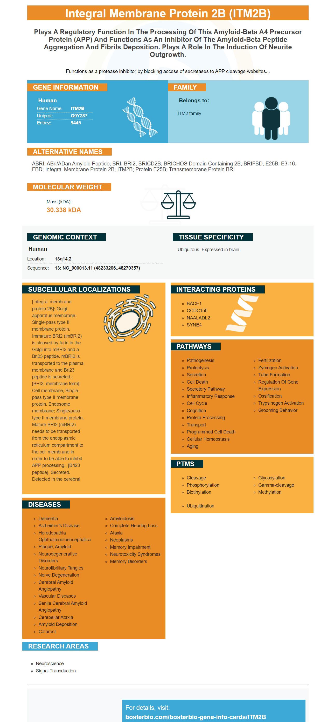 ABRI; ABri/ADan amyloid peptide; BRI; BRI2; BRICD2B; BRICHOS domain containing 2B; BRIFBD; E25B; E3-16; FBD; integral membrane protein 2B; ITM2B; Protein E25B; Transmembrane protein BRI