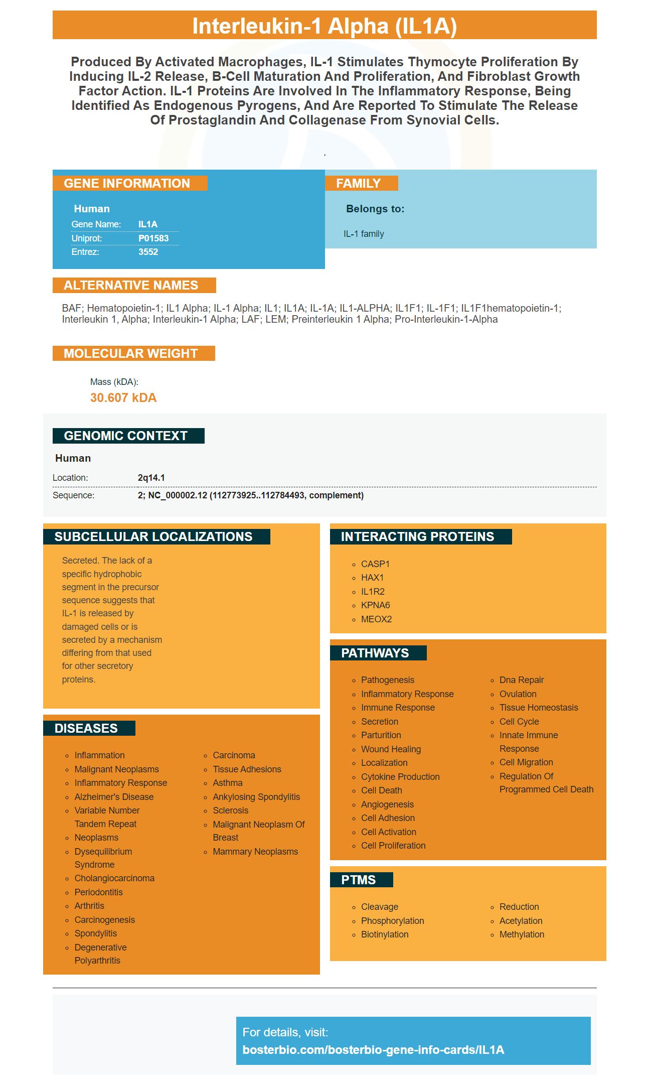 BAF; Hematopoietin-1; IL1 alpha; IL-1 alpha; IL1; IL1A; IL-1A; IL1-ALPHA; IL1F1; IL-1F1; IL1F1hematopoietin-1; interleukin 1, alpha; interleukin-1 alpha; LAF; LEM; preinterleukin 1 alpha; pro-interleukin-1-alpha