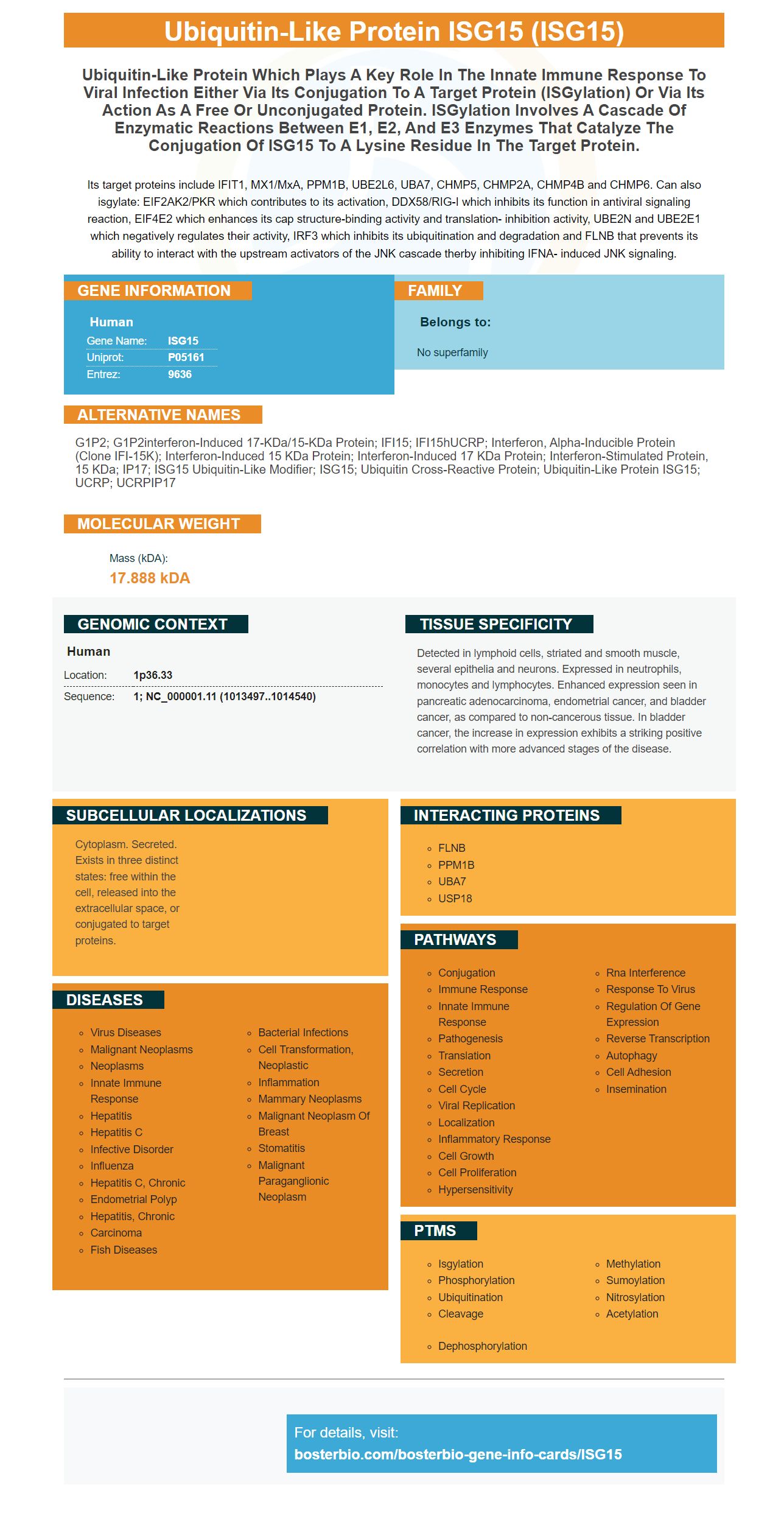 G1P2; G1P2interferon-induced 17-kDa/15-kDa protein; IFI15; IFI15hUCRP; interferon, alpha-inducible protein (clone IFI-15K); Interferon-induced 15 kDa protein; Interferon-induced 17 kDa protein; interferon-stimulated protein, 15 kDa; IP17; ISG15 ubiquitin-like modifier; ISG15; Ubiquitin cross-reactive protein; ubiquitin-like protein ISG15; UCRP; UCRPIP17