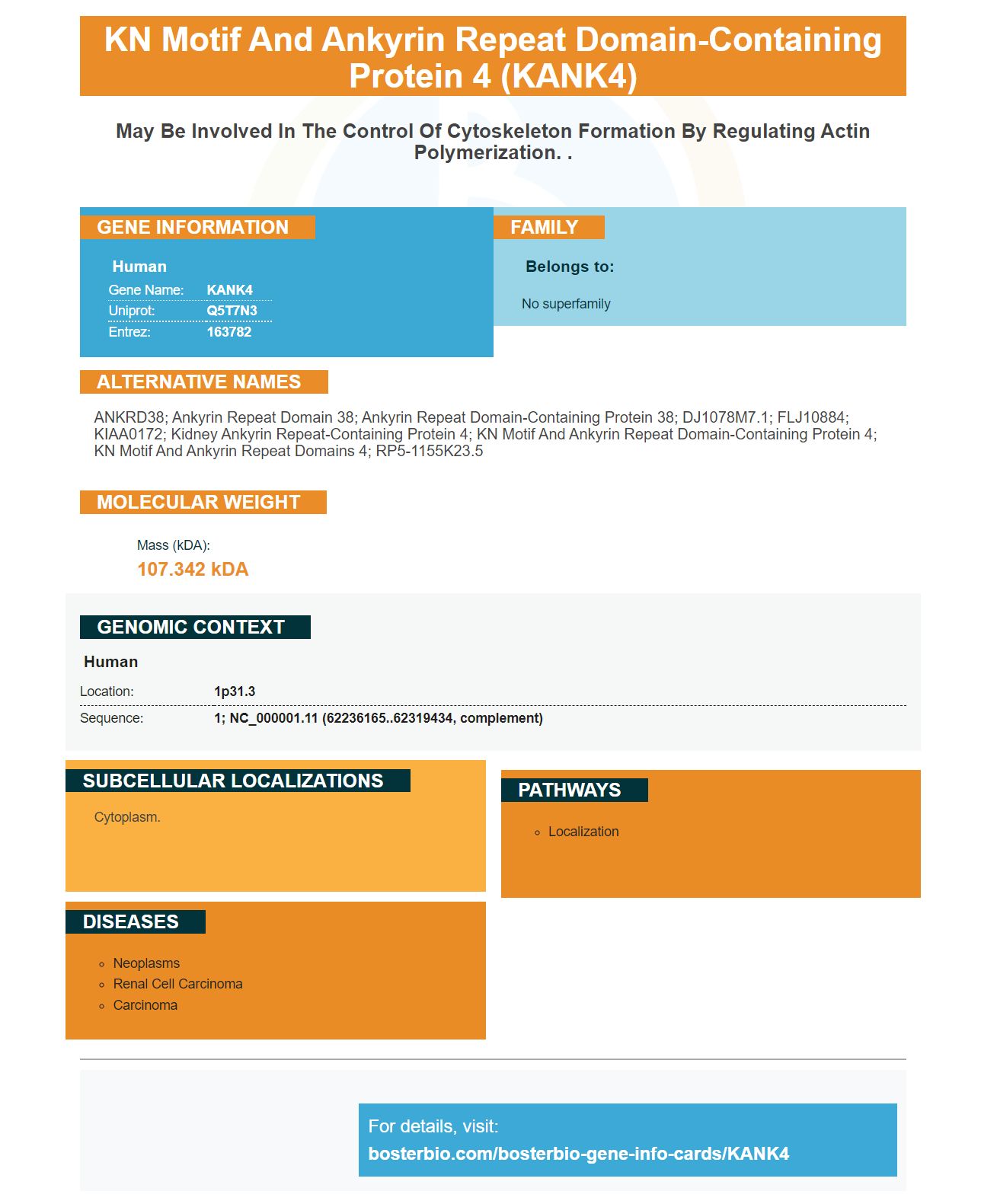 ANKRD38; ankyrin repeat domain 38; Ankyrin repeat domain-containing protein 38; dJ1078M7.1; FLJ10884; KIAA0172; kidney ankyrin repeat-containing protein 4; KN motif and ankyrin repeat domain-containing protein 4; KN motif and ankyrin repeat domains 4; RP5-1155K23.5