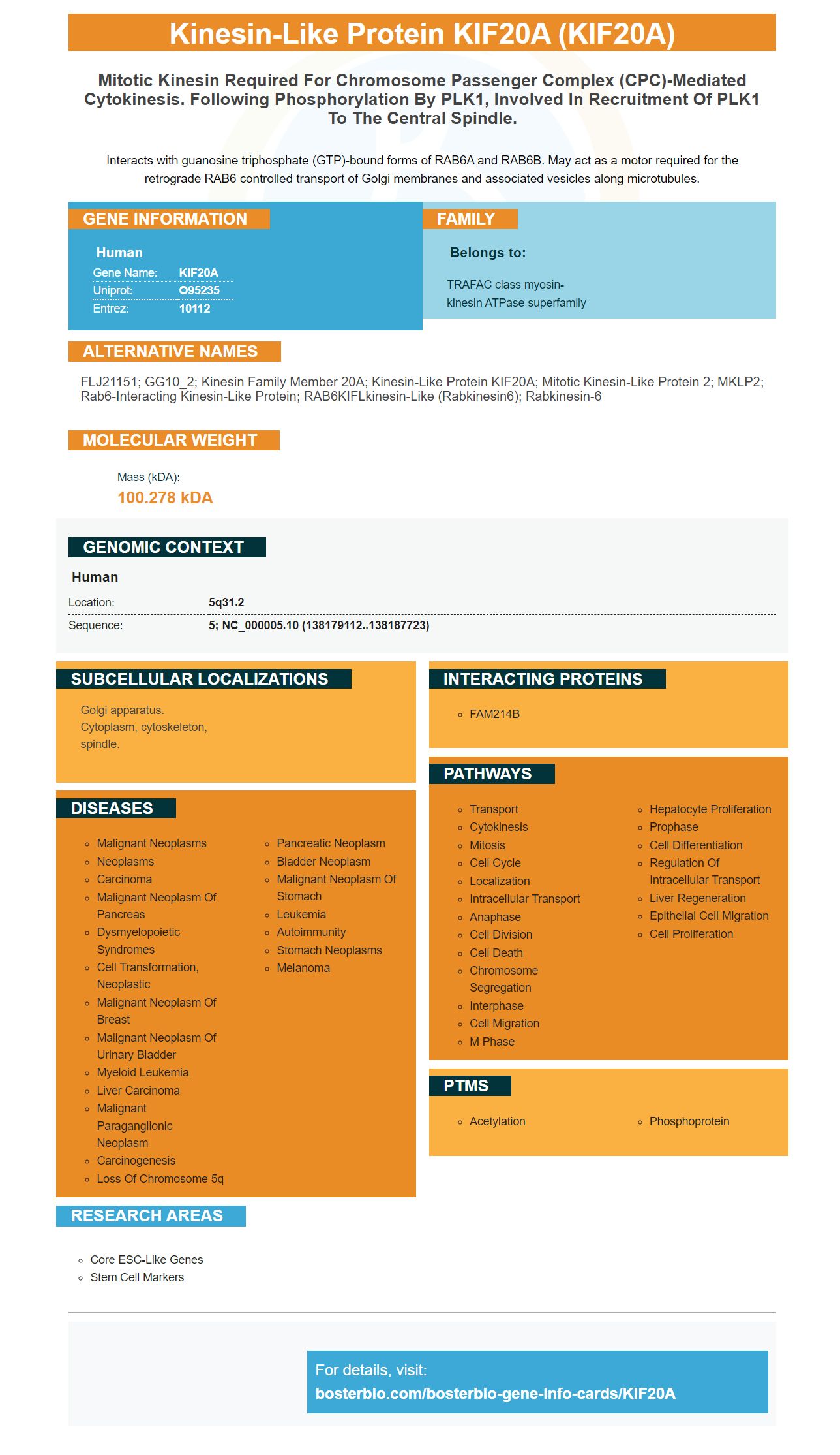 FLJ21151; GG10_2; kinesin family member 20A; kinesin-like protein KIF20A; mitotic kinesin-like protein 2; MKLP2; Rab6-interacting kinesin-like protein; RAB6KIFLkinesin-like (rabkinesin6); rabkinesin-6