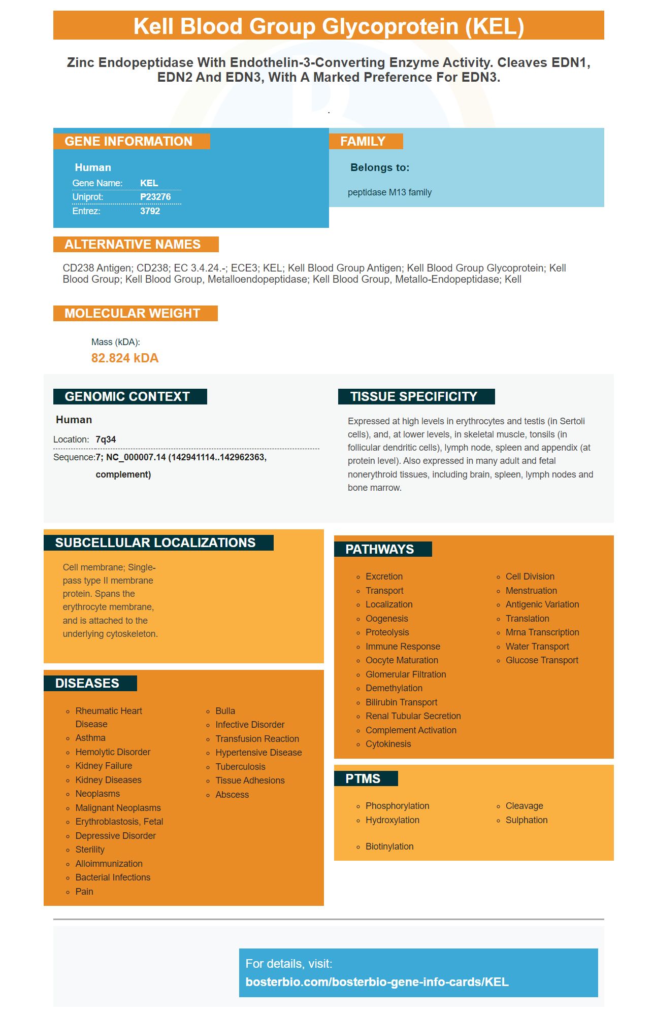 CD238 antigen; CD238; EC 3.4.24.-; ECE3; KEL; kell blood group antigen; kell blood group glycoprotein; Kell blood group; Kell blood group, metalloendopeptidase; Kell blood group, metallo-endopeptidase; Kell