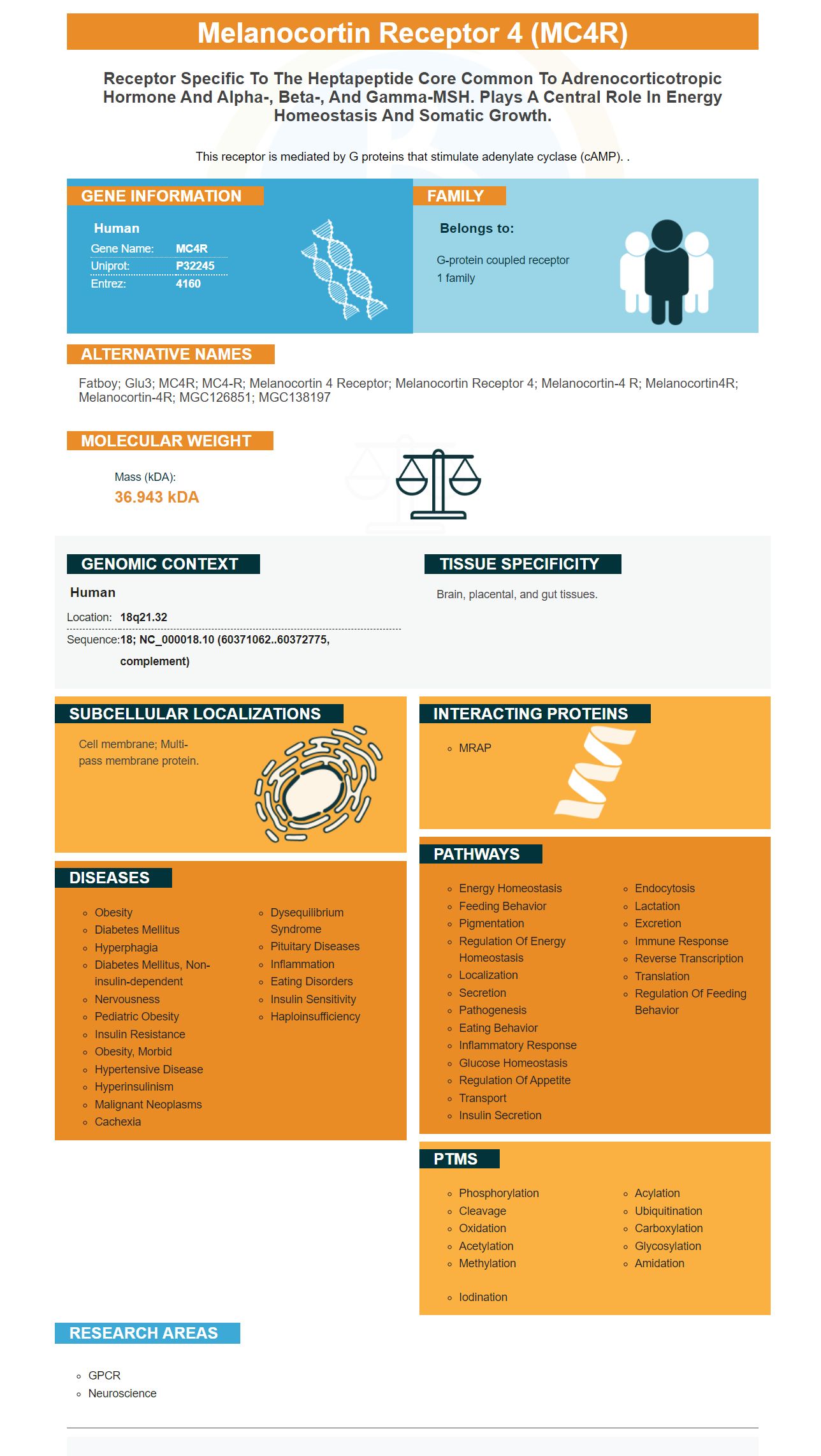 Fatboy; Glu3; MC4R; MC4-R; melanocortin 4 receptor; melanocortin receptor 4; Melanocortin-4 R; Melanocortin4R; Melanocortin-4R; MGC126851; MGC138197