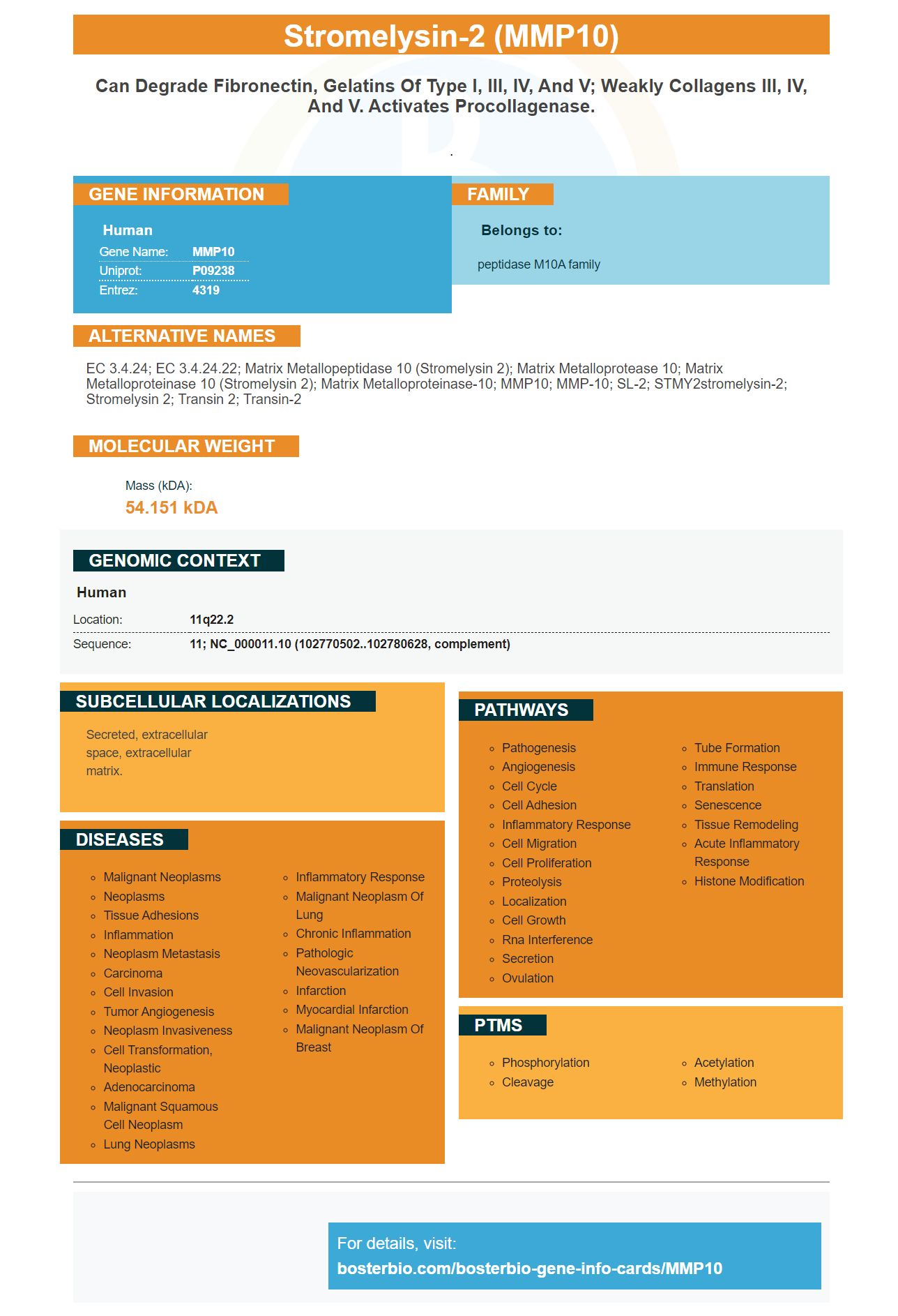 EC 3.4.24; EC 3.4.24.22; matrix metallopeptidase 10 (stromelysin 2); matrix metalloprotease 10; matrix metalloproteinase 10 (stromelysin 2); Matrix metalloproteinase-10; MMP10; MMP-10; SL-2; STMY2stromelysin-2; Stromelysin 2; transin 2; transin-2