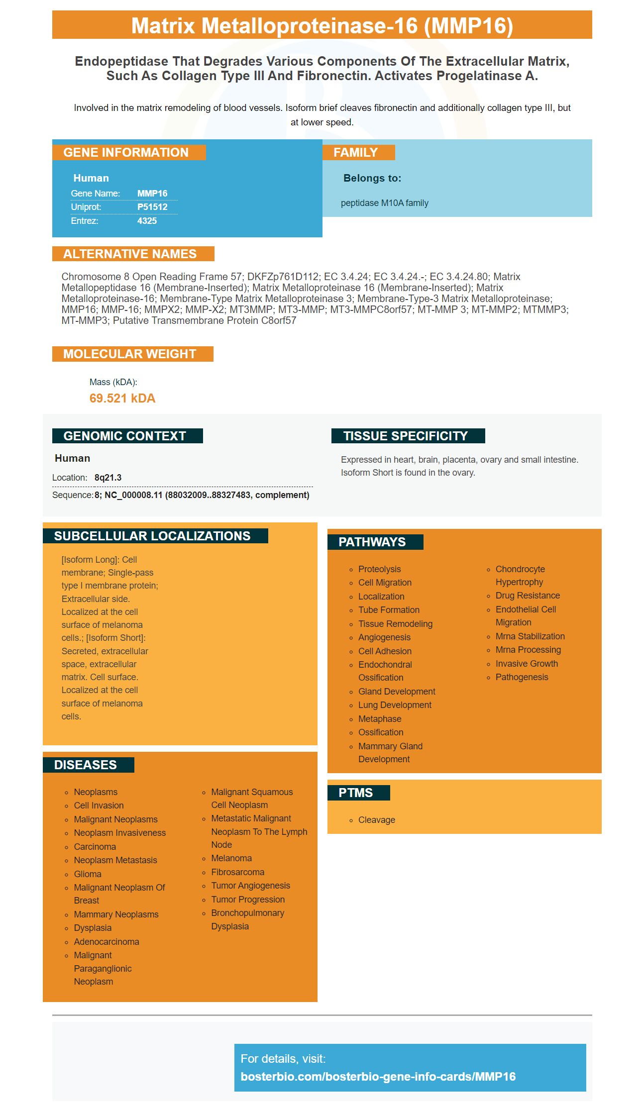 chromosome 8 open reading frame 57; DKFZp761D112; EC 3.4.24; EC 3.4.24.-; EC 3.4.24.80; matrix metallopeptidase 16 (membrane-inserted); matrix metalloproteinase 16 (membrane-inserted); matrix metalloproteinase-16; Membrane-type matrix metalloproteinase 3; Membrane-type-3 matrix metalloproteinase; MMP16; MMP-16; MMPX2; MMP-X2; MT3MMP; MT3-MMP; MT3-MMPC8orf57; MT-MMP 3; MT-MMP2; MTMMP3; MT-MMP3; Putative transmembrane protein C8orf57