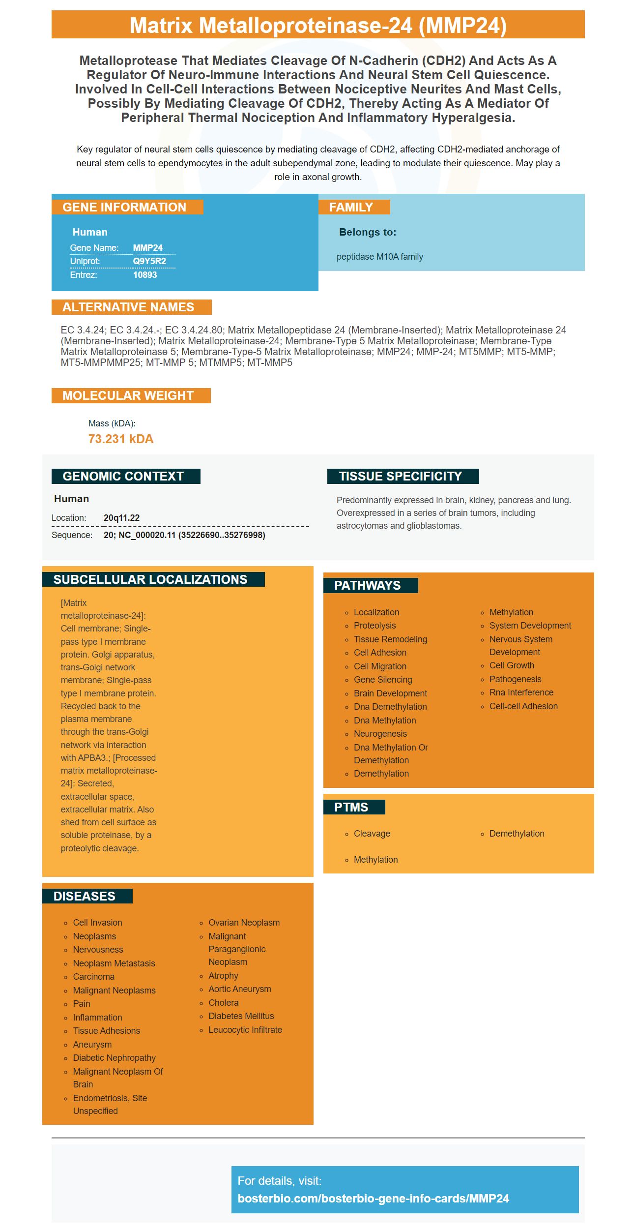 EC 3.4.24; EC 3.4.24.-; EC 3.4.24.80; matrix metallopeptidase 24 (membrane-inserted); matrix metalloproteinase 24 (membrane-inserted); matrix metalloproteinase-24; membrane-type 5 matrix metalloproteinase; Membrane-type matrix metalloproteinase 5; Membrane-type-5 matrix metalloproteinase; MMP24; MMP-24; MT5MMP; MT5-MMP; MT5-MMPMMP25; MT-MMP 5; MTMMP5; MT-MMP5