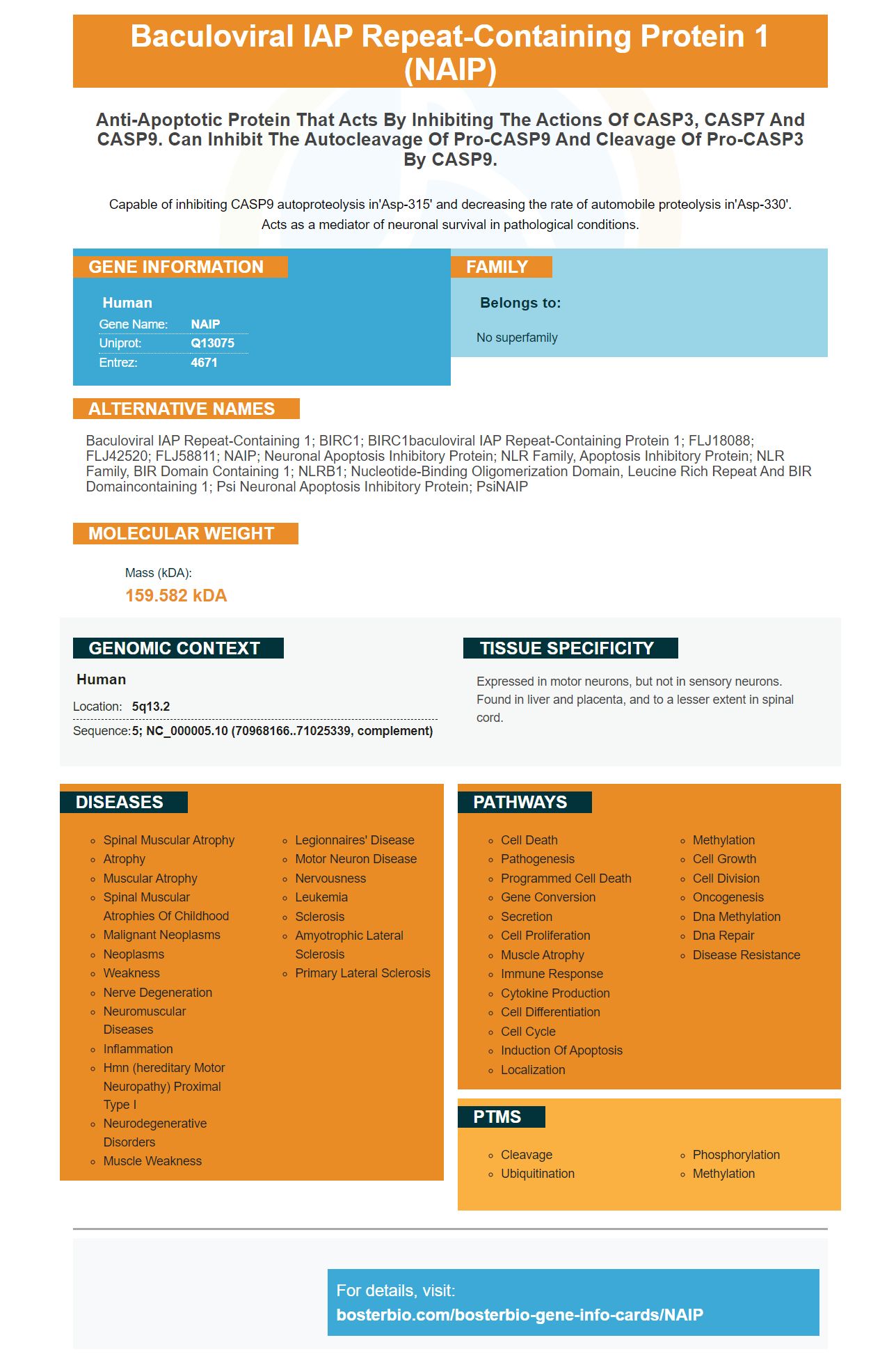 baculoviral IAP repeat-containing 1; BIRC1; BIRC1baculoviral IAP repeat-containing protein 1; FLJ18088; FLJ42520; FLJ58811; NAIP; Neuronal apoptosis inhibitory protein; NLR family, apoptosis inhibitory protein; NLR family, BIR domain containing 1; NLRB1; nucleotide-binding oligomerization domain, leucine rich repeat and BIR domaincontaining 1; psi neuronal apoptosis inhibitory protein; psiNAIP