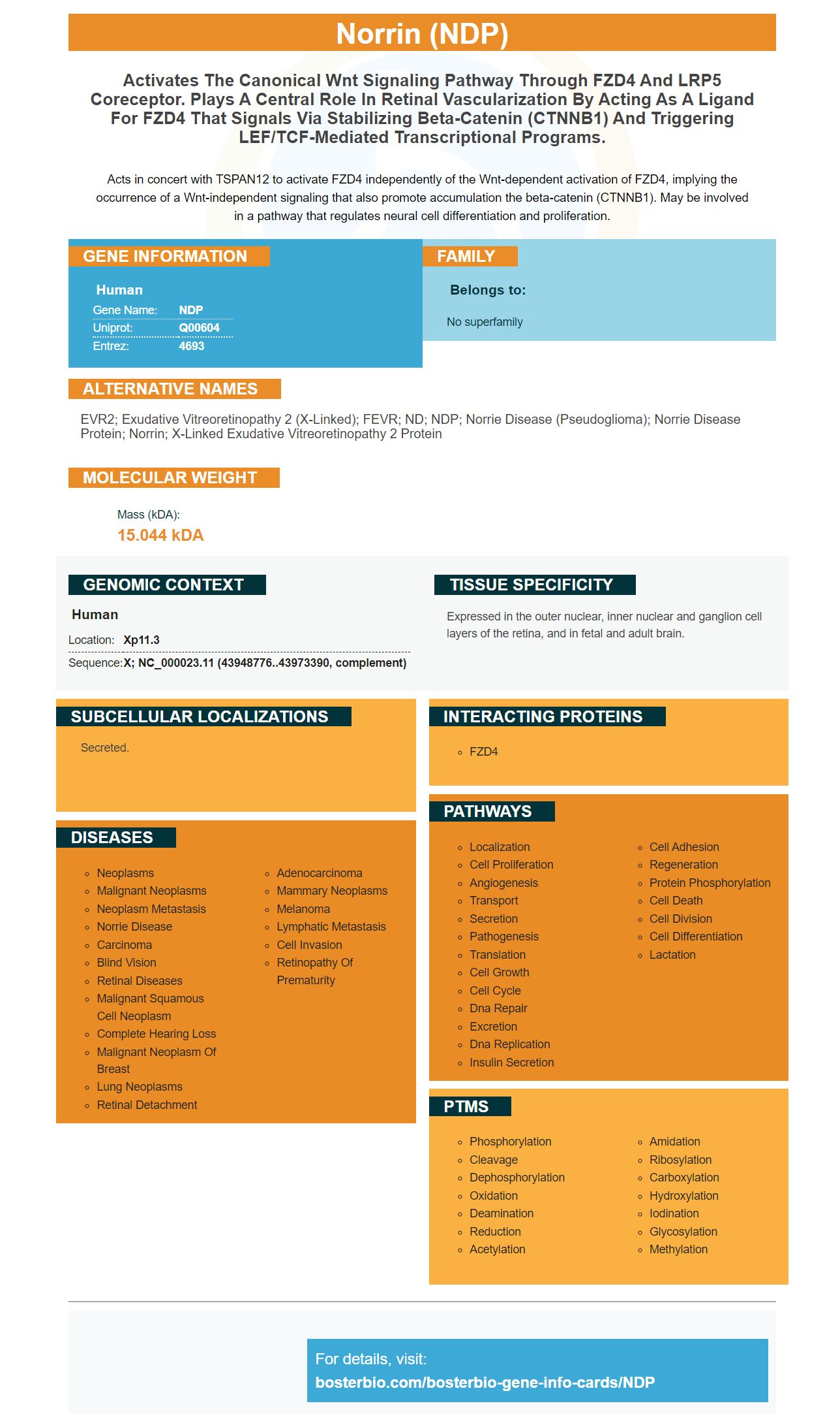 EVR2; exudative vitreoretinopathy 2 (X-linked); FEVR; ND; NDP; Norrie disease (pseudoglioma); Norrie disease protein; Norrin; X-linked exudative vitreoretinopathy 2 protein