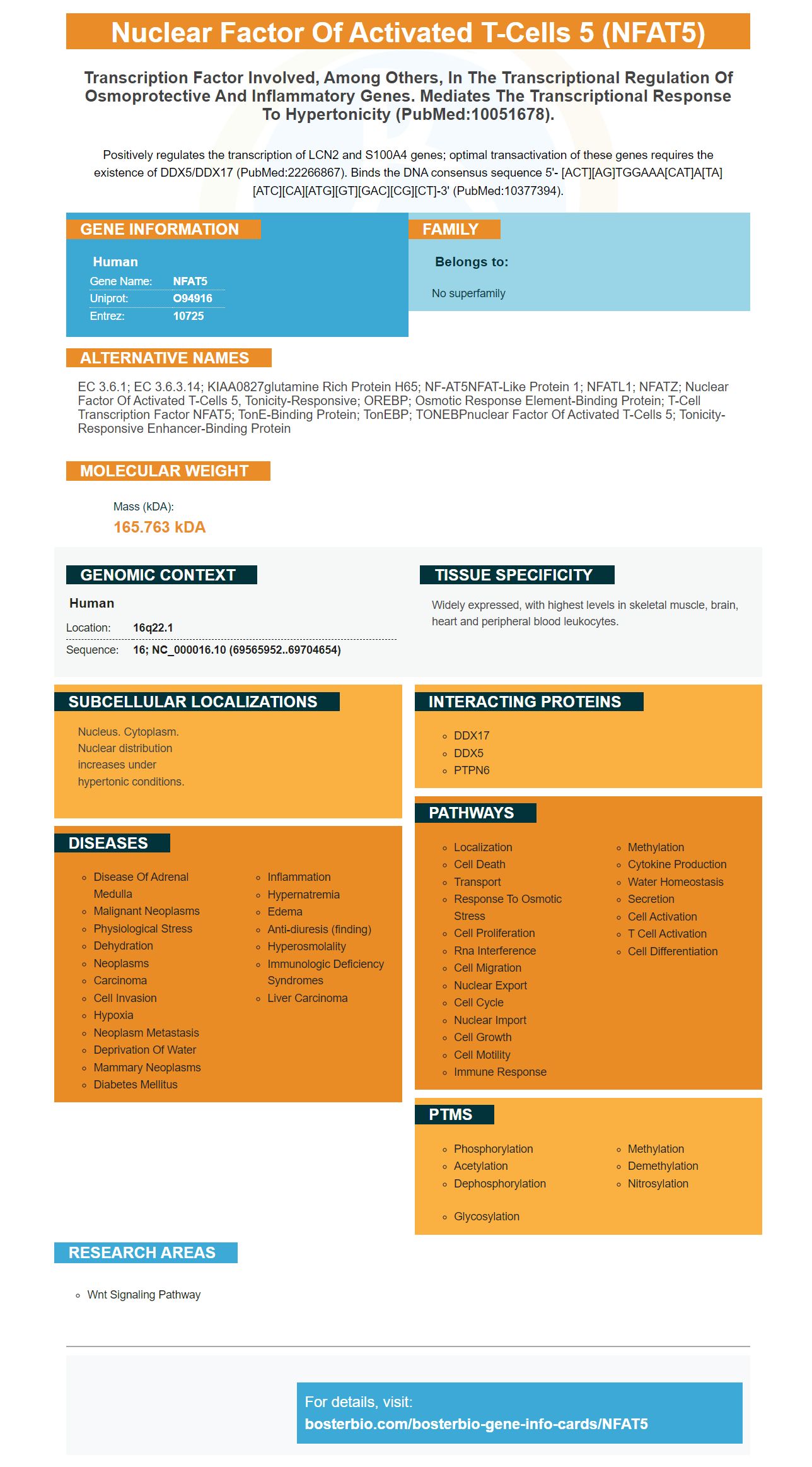 EC 3.6.1; EC 3.6.3.14; KIAA0827glutamine rich protein H65; NF-AT5NFAT-like protein 1; NFATL1; NFATZ; nuclear factor of activated T-cells 5, tonicity-responsive; OREBP; osmotic response element-binding protein; T-cell transcription factor NFAT5; TonE-binding protein; TonEBP; TONEBPnuclear factor of activated T-cells 5; Tonicity-responsive enhancer-binding protein