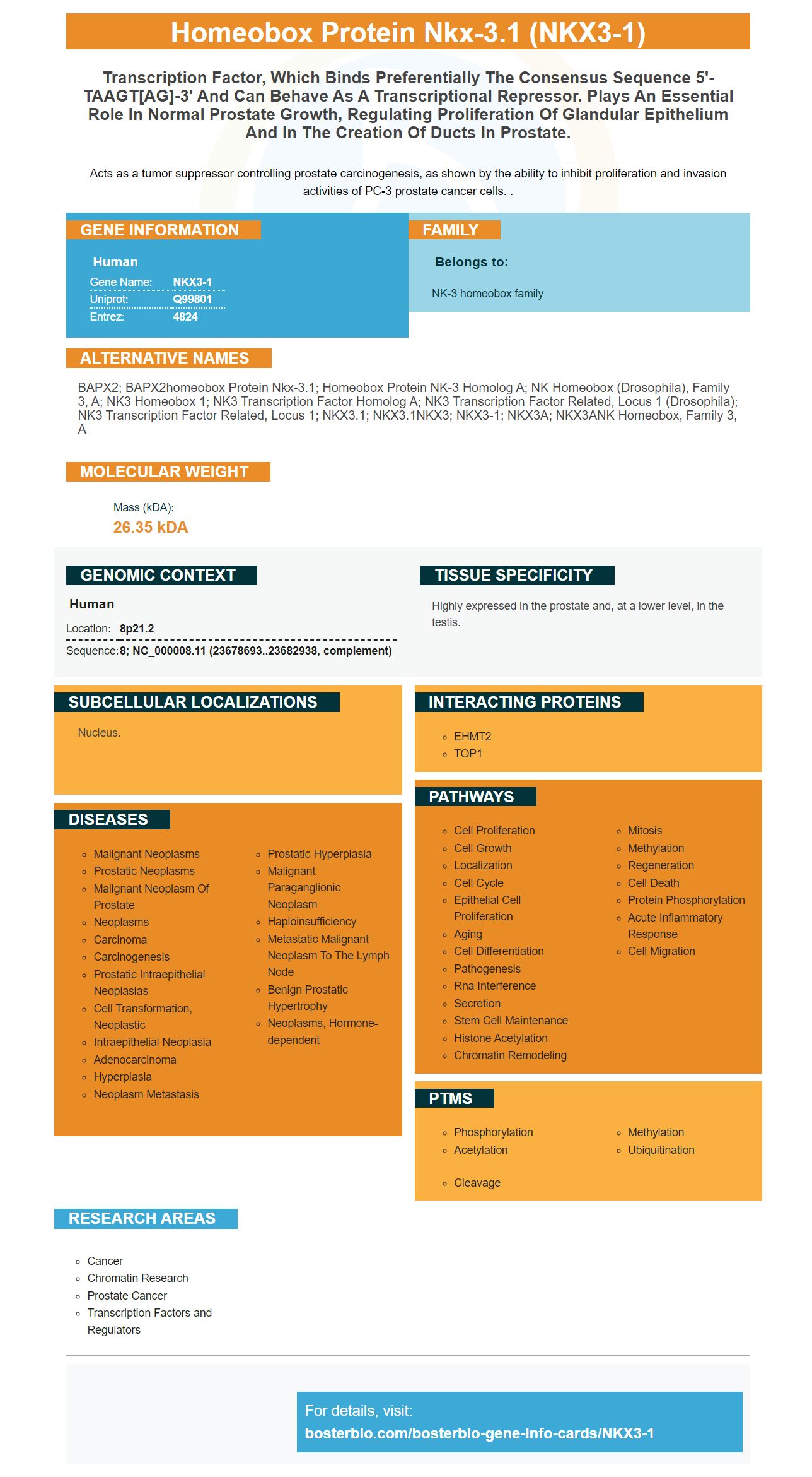 BAPX2; BAPX2homeobox protein Nkx-3.1; Homeobox protein NK-3 homolog A; NK homeobox (Drosophila), family 3, A; NK3 homeobox 1; NK3 transcription factor homolog A; NK3 transcription factor related, locus 1 (Drosophila); NK3 transcription factor related, locus 1; NKX3.1; NKX3.1NKX3; NKX3-1; NKX3A; NKX3ANK homeobox, family 3, A
