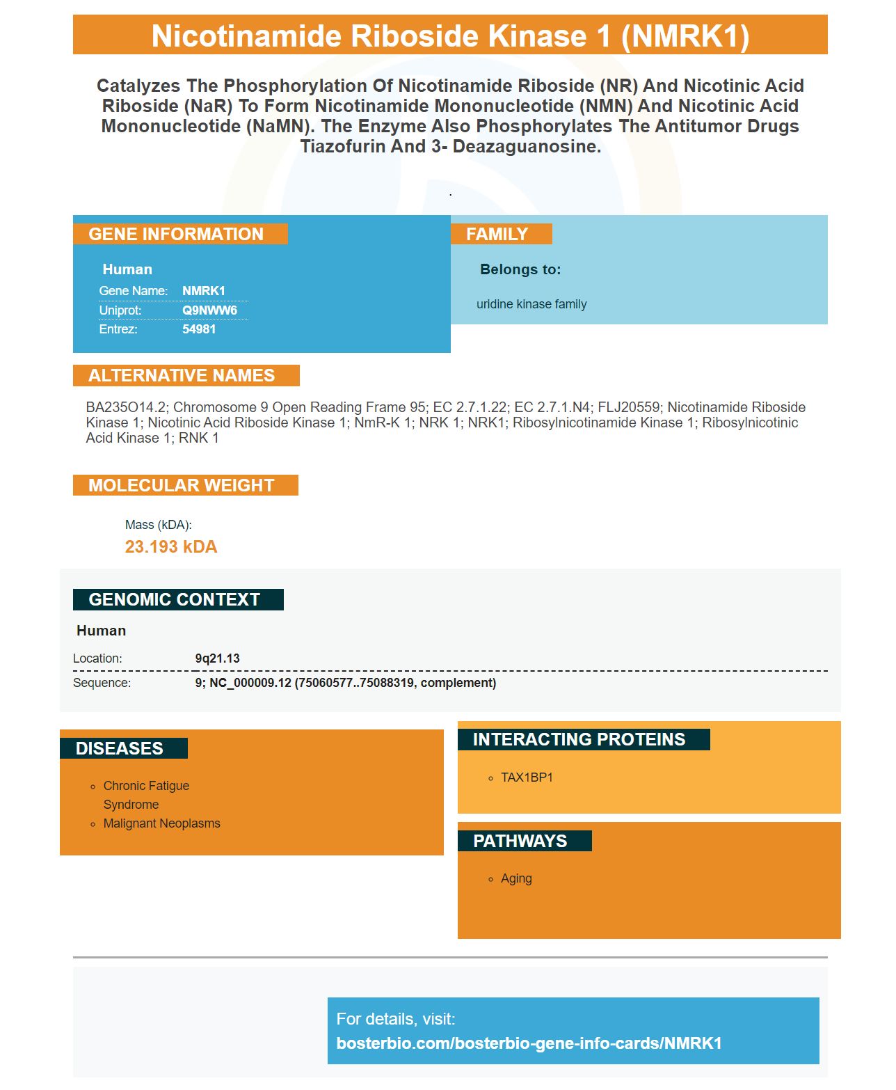 bA235O14.2; chromosome 9 open reading frame 95; EC 2.7.1.22; EC 2.7.1.n4; FLJ20559; nicotinamide riboside kinase 1; Nicotinic acid riboside kinase 1; NmR-K 1; NRK 1; NRK1; Ribosylnicotinamide kinase 1; Ribosylnicotinic acid kinase 1; RNK 1