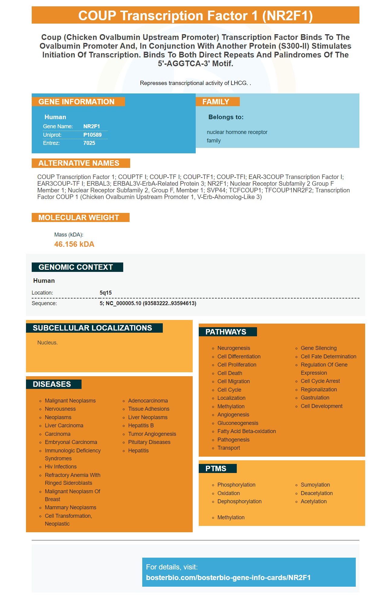 COUP transcription factor 1; COUPTF I; COUP-TF I; COUP-TF1; COUP-TFI; EAR-3COUP transcription factor I; EAR3COUP-TF I; ERBAL3; ERBAL3V-erbA-related protein 3; NR2F1; Nuclear receptor subfamily 2 group F member 1; nuclear receptor subfamily 2, group F, member 1; SVP44; TCFCOUP1; TFCOUP1NR2F2; transcription factor COUP 1 (chicken ovalbumin upstream promoter 1, v-erb-ahomolog-like 3)