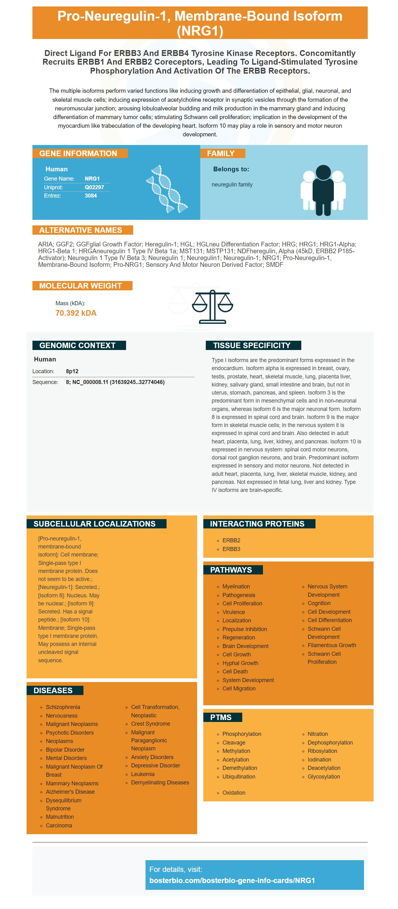 ARIA; GGF2; GGFglial growth factor; Heregulin-1; HGL; HGLneu differentiation factor; HRG; HRG1; HRG1-alpha; HRG1-beta 1; HRGAneuregulin 1 type IV beta 1a; MST131; MSTP131; NDFheregulin, alpha (45kD, ERBB2 p185-activator); neuregulin 1 type IV beta 3; neuregulin 1; Neuregulin1; Neuregulin-1; NRG1; pro-neuregulin-1, membrane-bound isoform; pro-NRG1; sensory and motor neuron derived factor; SMDF