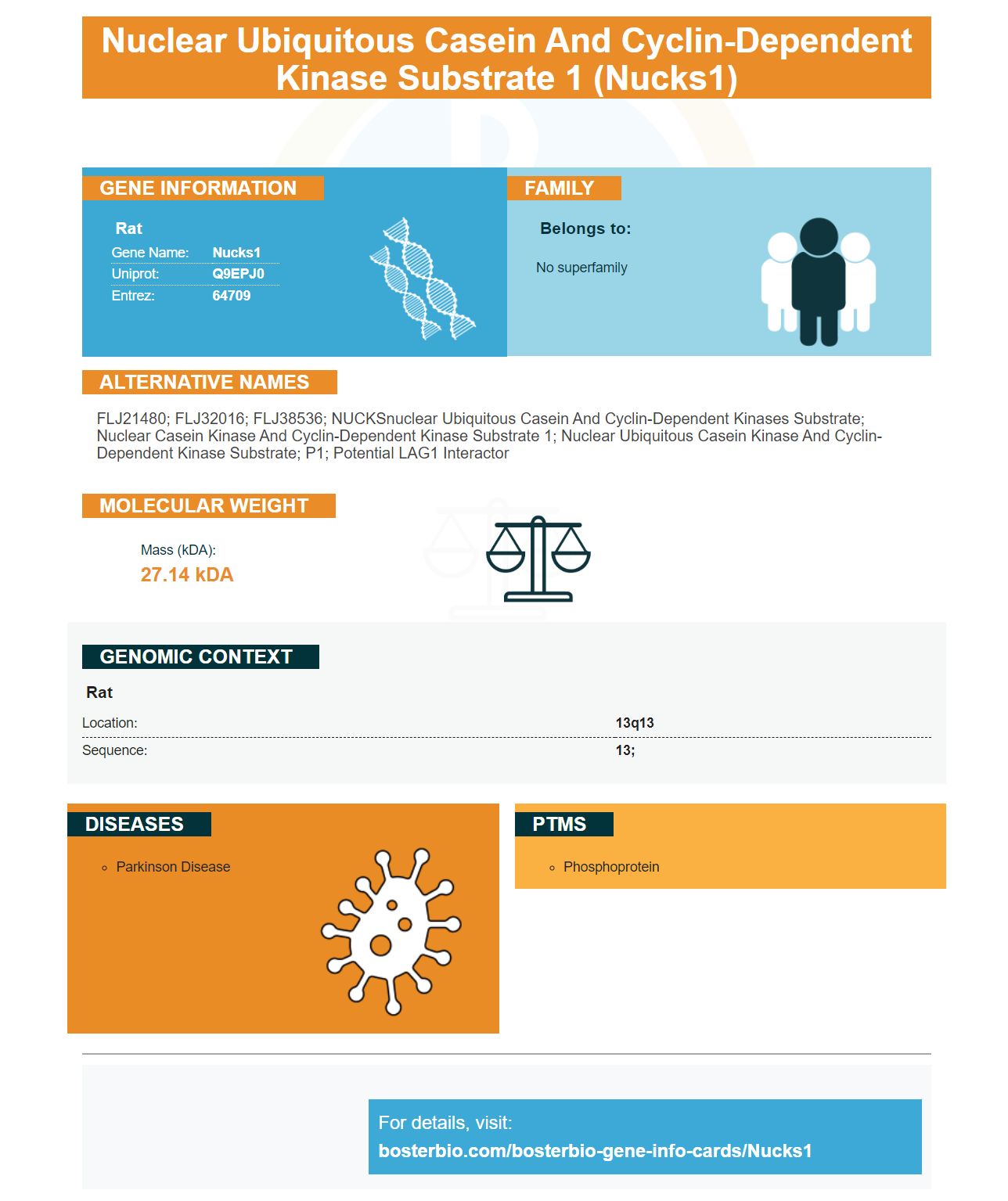 FLJ21480; FLJ32016; FLJ38536; NUCKSnuclear ubiquitous casein and cyclin-dependent kinases substrate; nuclear casein kinase and cyclin-dependent kinase substrate 1; nuclear ubiquitous casein kinase and cyclin-dependent kinase substrate; P1; potential LAG1 interactor