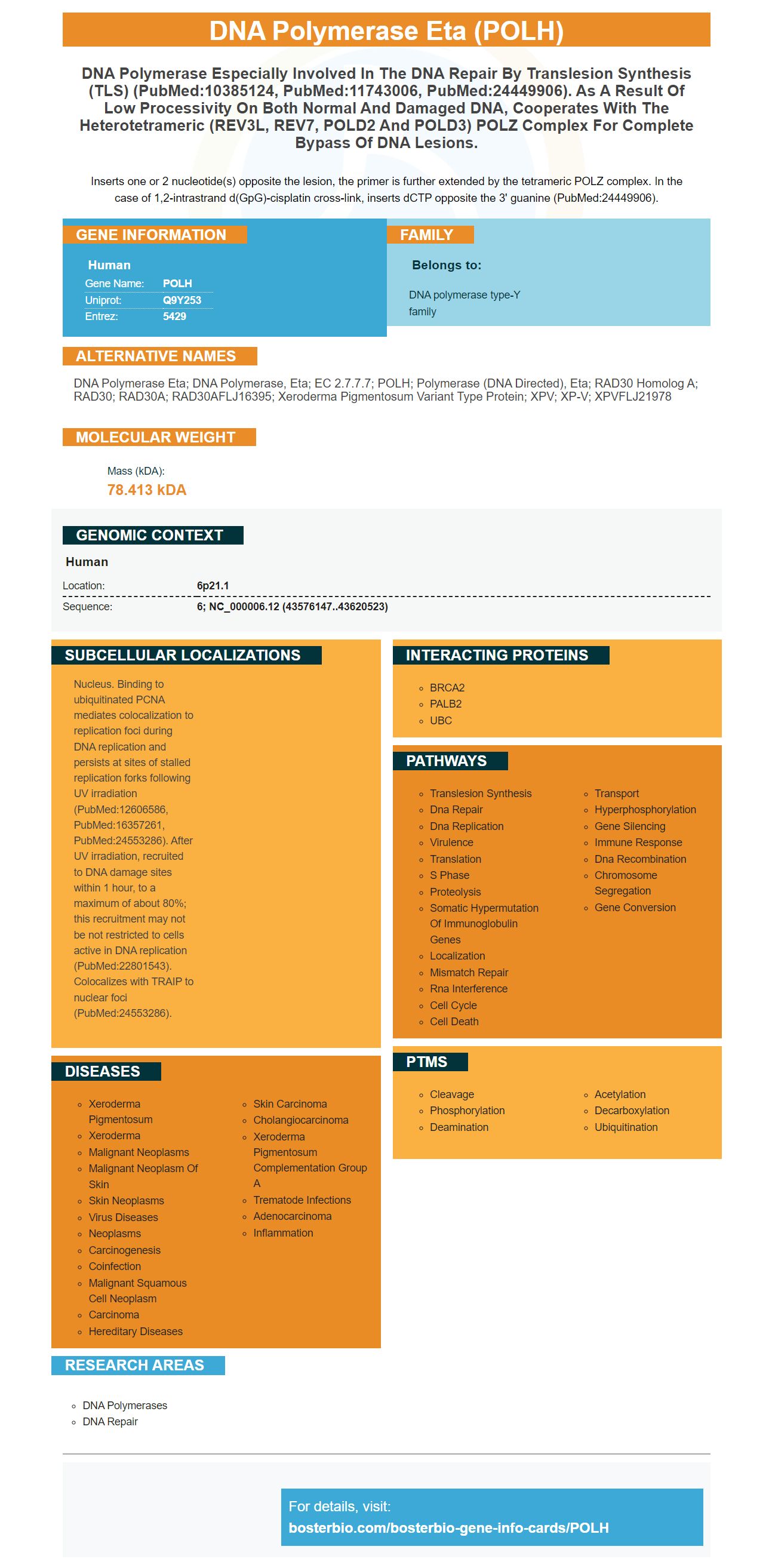DNA polymerase eta; DNA Polymerase, eta; EC 2.7.7.7; POLH; polymerase (DNA directed), eta; RAD30 homolog A; RAD30; RAD30A; RAD30AFLJ16395; Xeroderma pigmentosum variant type protein; XPV; XP-V; XPVFLJ21978