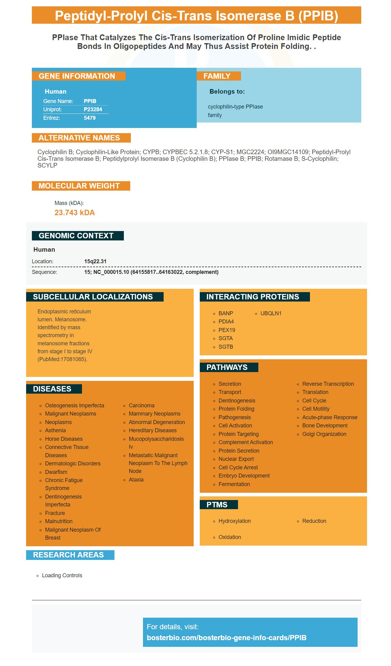 Cyclophilin B; cyclophilin-like protein; CYPB; CYPBEC 5.2.1.8; CYP-S1; MGC2224; OI9MGC14109; peptidyl-prolyl cis-trans isomerase B; peptidylprolyl isomerase B (cyclophilin B); PPIase B; PPIB; Rotamase B; S-cyclophilin; SCYLP