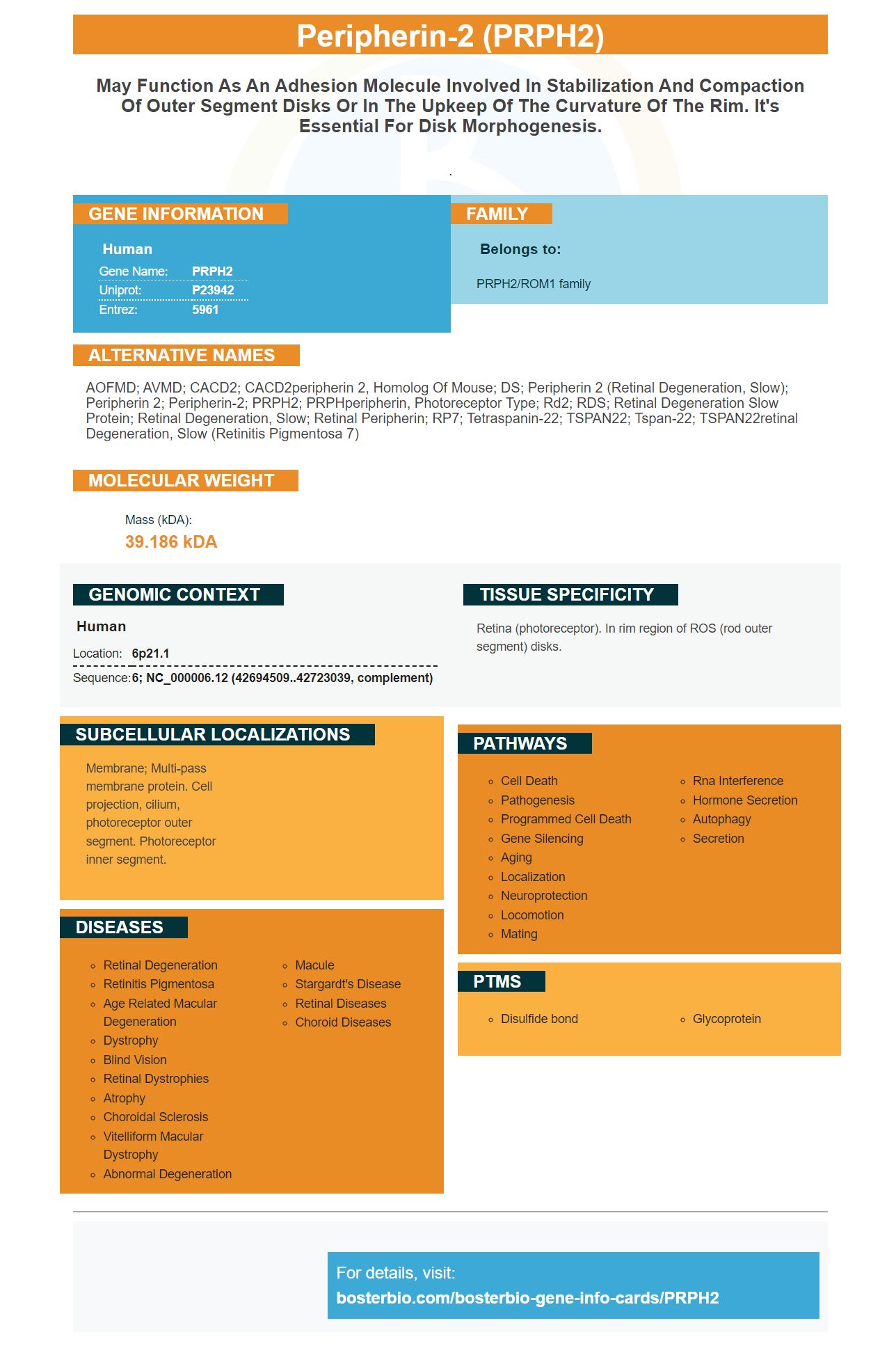 AOFMD; AVMD; CACD2; CACD2peripherin 2, homolog of mouse; DS; peripherin 2 (retinal degeneration, slow); Peripherin 2; peripherin-2; PRPH2; PRPHperipherin, photoreceptor type; rd2; RDS; Retinal degeneration slow protein; retinal degeneration, slow; retinal peripherin; RP7; Tetraspanin-22; TSPAN22; tspan-22; TSPAN22retinal degeneration, slow (retinitis pigmentosa 7)