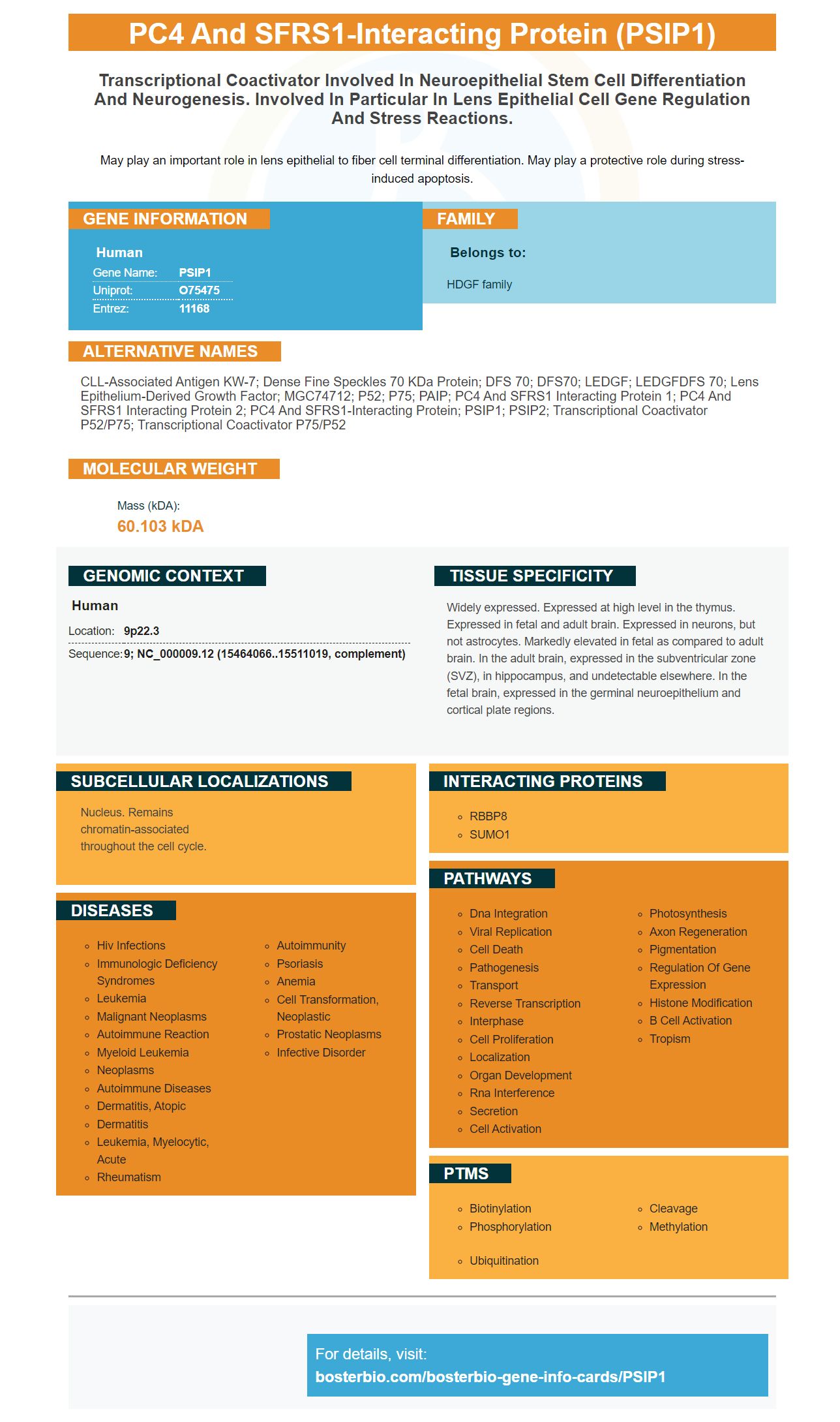 CLL-associated antigen KW-7; Dense fine speckles 70 kDa protein; DFS 70; DFS70; LEDGF; LEDGFDFS 70; Lens epithelium-derived growth factor; MGC74712; p52; p75; PAIP; PC4 and SFRS1 interacting protein 1; PC4 and SFRS1 interacting protein 2; PC4 and SFRS1-interacting protein; PSIP1; PSIP2; transcriptional coactivator p52/p75; Transcriptional coactivator p75/p52
