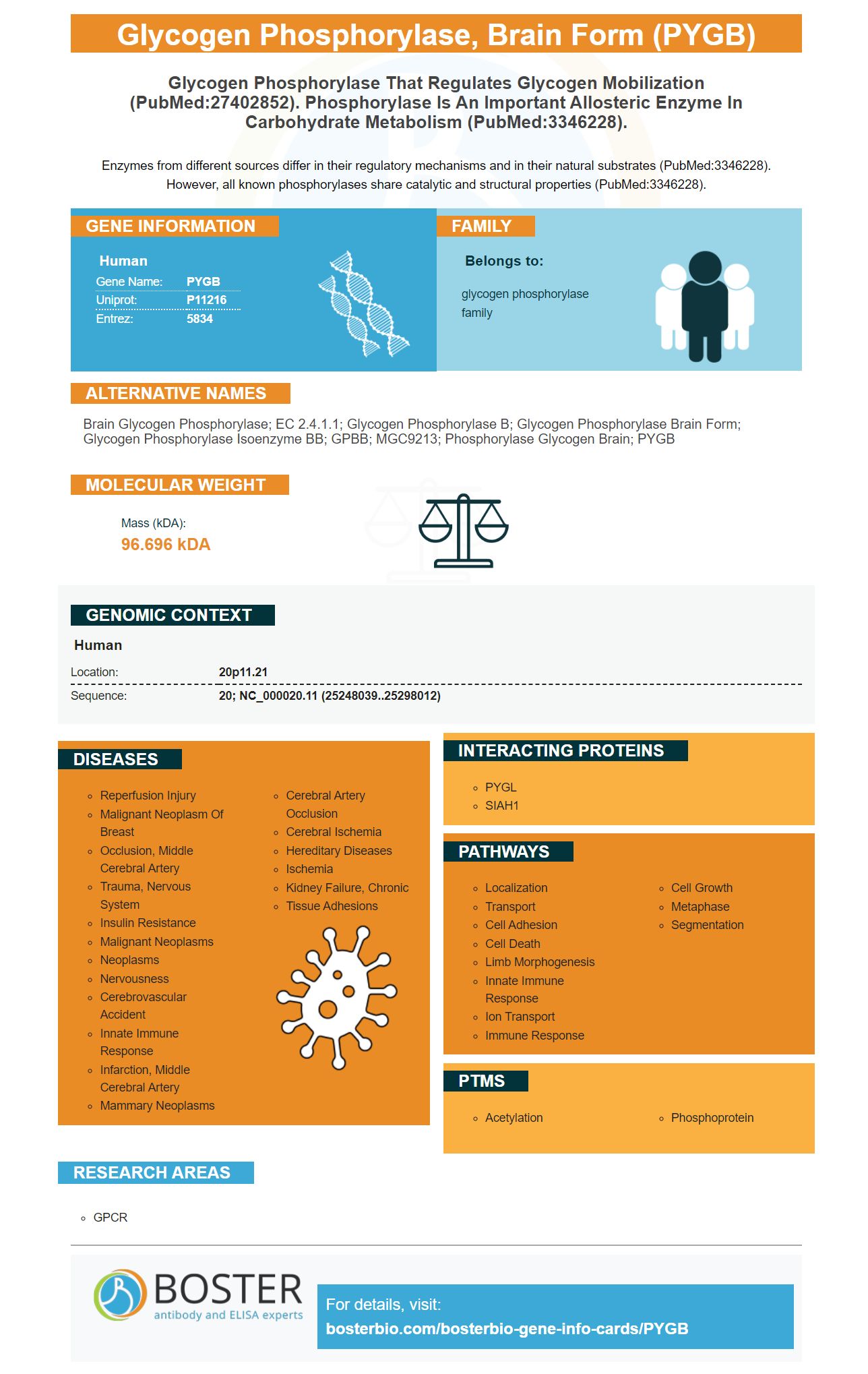 Brain glycogen phosphorylase; EC 2.4.1.1; Glycogen phosphorylase B; Glycogen phosphorylase brain form; Glycogen Phosphorylase Isoenzyme BB; GPBB; MGC9213; Phosphorylase glycogen brain; PYGB