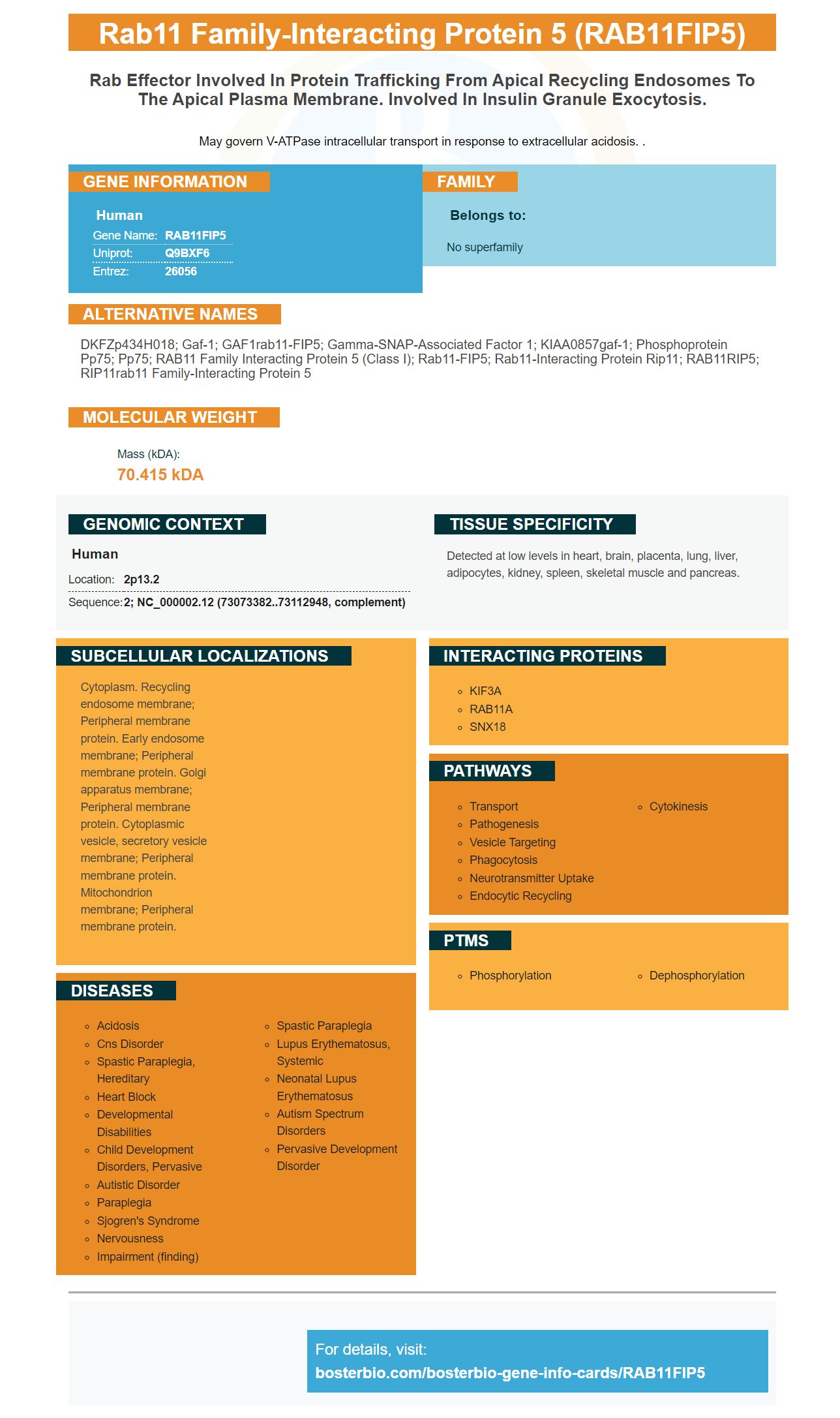 DKFZp434H018; Gaf-1; GAF1rab11-FIP5; Gamma-SNAP-associated factor 1; KIAA0857gaf-1; Phosphoprotein pp75; pp75; RAB11 family interacting protein 5 (class I); Rab11-FIP5; Rab11-interacting protein Rip11; RAB11RIP5; RIP11rab11 family-interacting protein 5