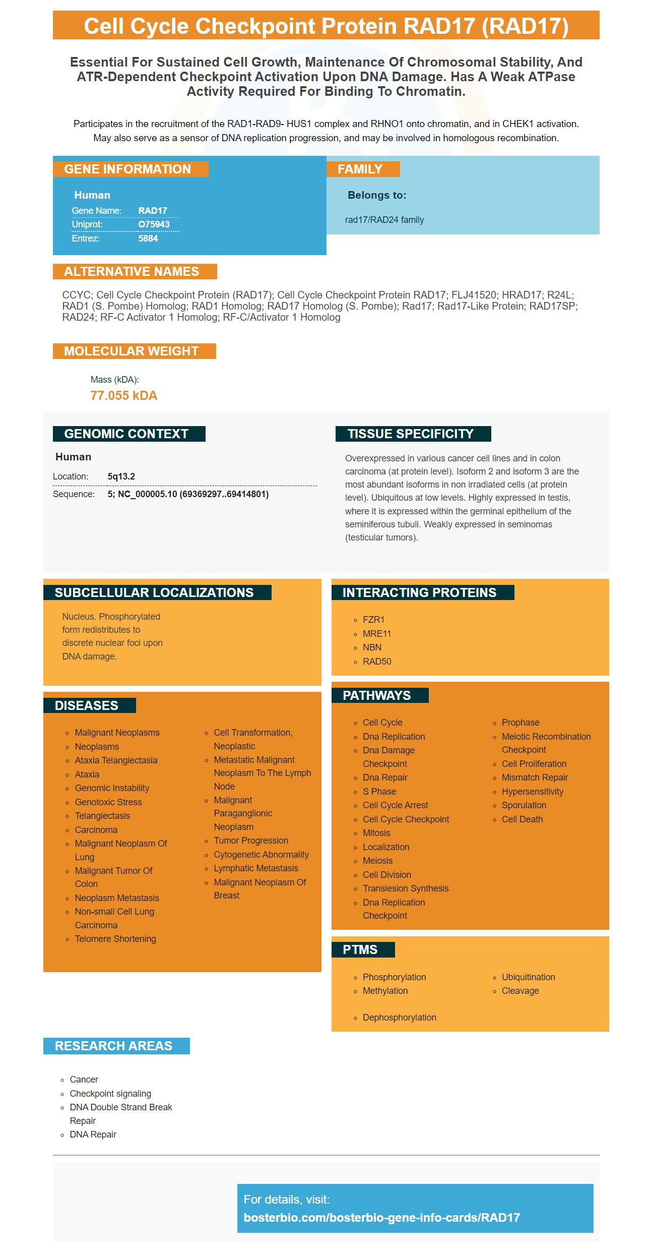 CCYC; cell cycle checkpoint protein (RAD17); cell cycle checkpoint protein RAD17; FLJ41520; HRAD17; R24L; RAD1 (S. pombe) homolog; RAD1 homolog; RAD17 homolog (S. pombe); Rad17; Rad17-like protein; RAD17SP; RAD24; RF-C activator 1 homolog; RF-C/activator 1 homolog