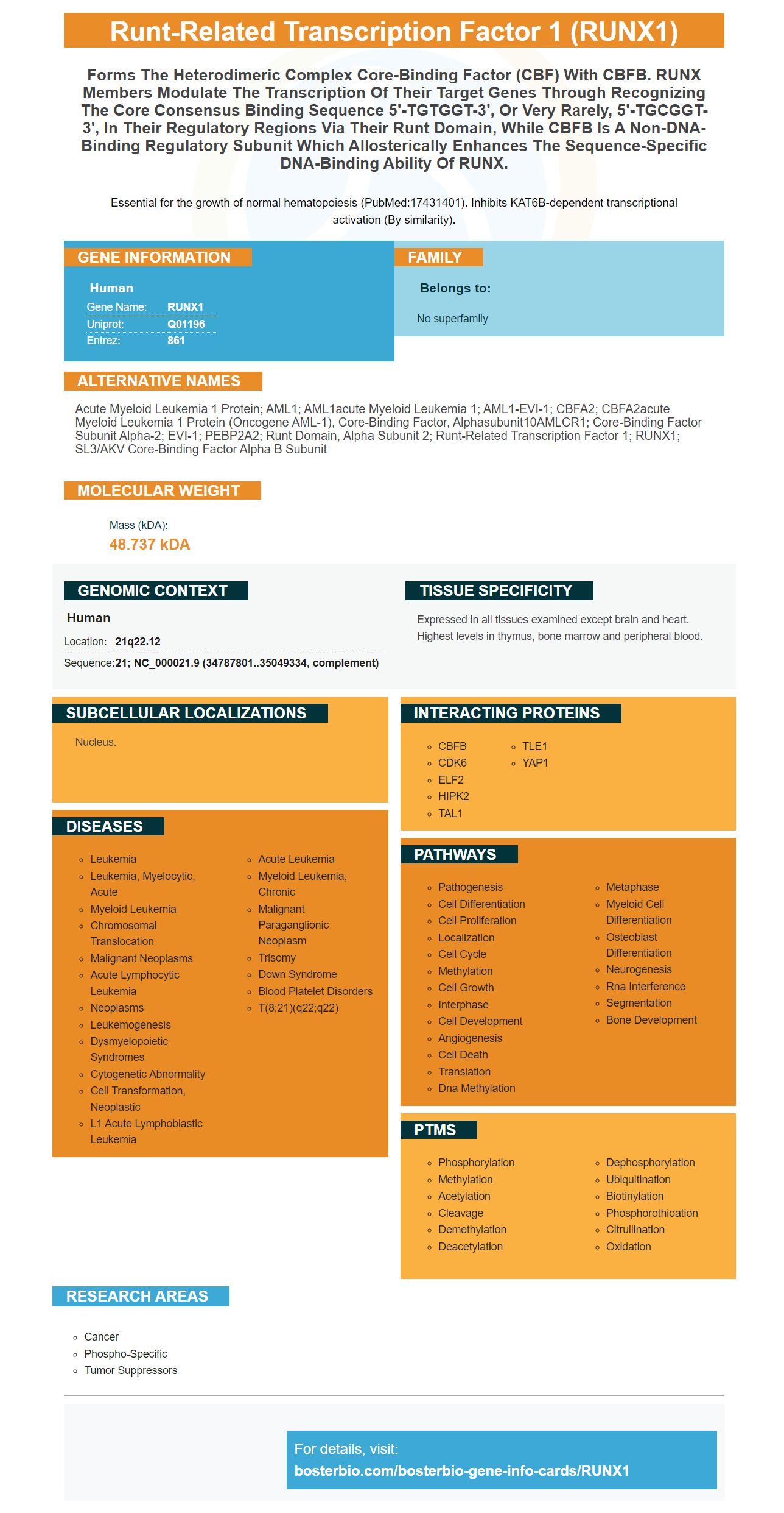 Acute myeloid leukemia 1 protein; AML1; AML1acute myeloid leukemia 1; AML1-EVI-1; CBFA2; CBFA2acute myeloid leukemia 1 protein (oncogene AML-1), core-binding factor, alphasubunit10AMLCR1; Core-binding factor subunit alpha-2; EVI-1; PEBP2A2; runt domain, alpha subunit 2; runt-related transcription factor 1; RUNX1; SL3/AKV core-binding factor alpha B subunit