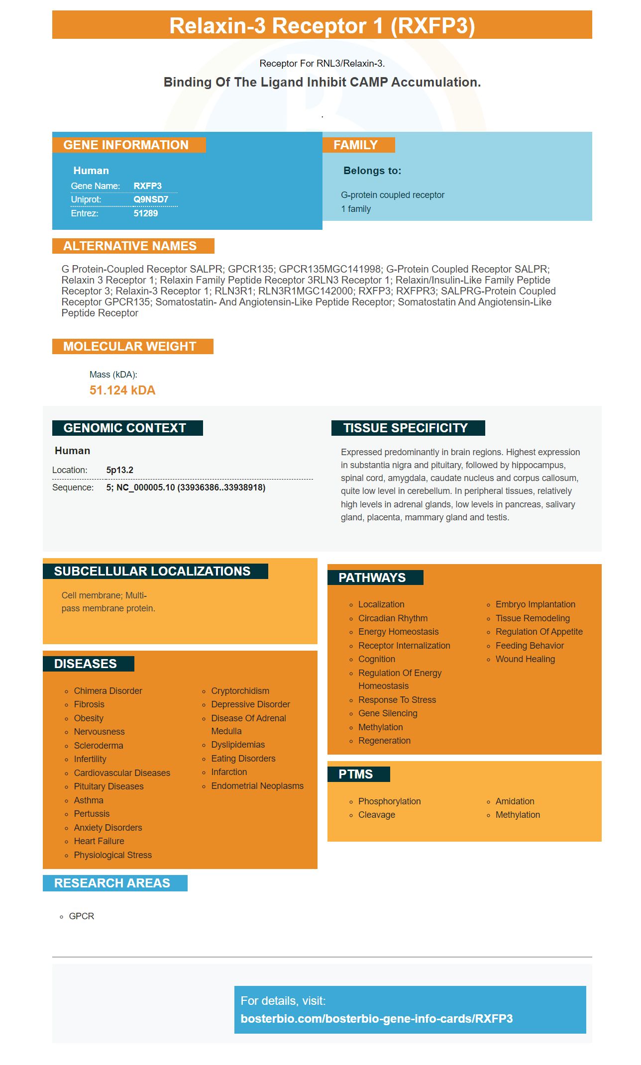 G protein-coupled receptor SALPR; GPCR135; GPCR135MGC141998; G-protein coupled receptor SALPR; relaxin 3 receptor 1; Relaxin family peptide receptor 3RLN3 receptor 1; relaxin/insulin-like family peptide receptor 3; relaxin-3 receptor 1; RLN3R1; RLN3R1MGC142000; RXFP3; RXFPR3; SALPRG-protein coupled receptor GPCR135; Somatostatin- and angiotensin-like peptide receptor; somatostatin and angiotensin-like peptide receptor