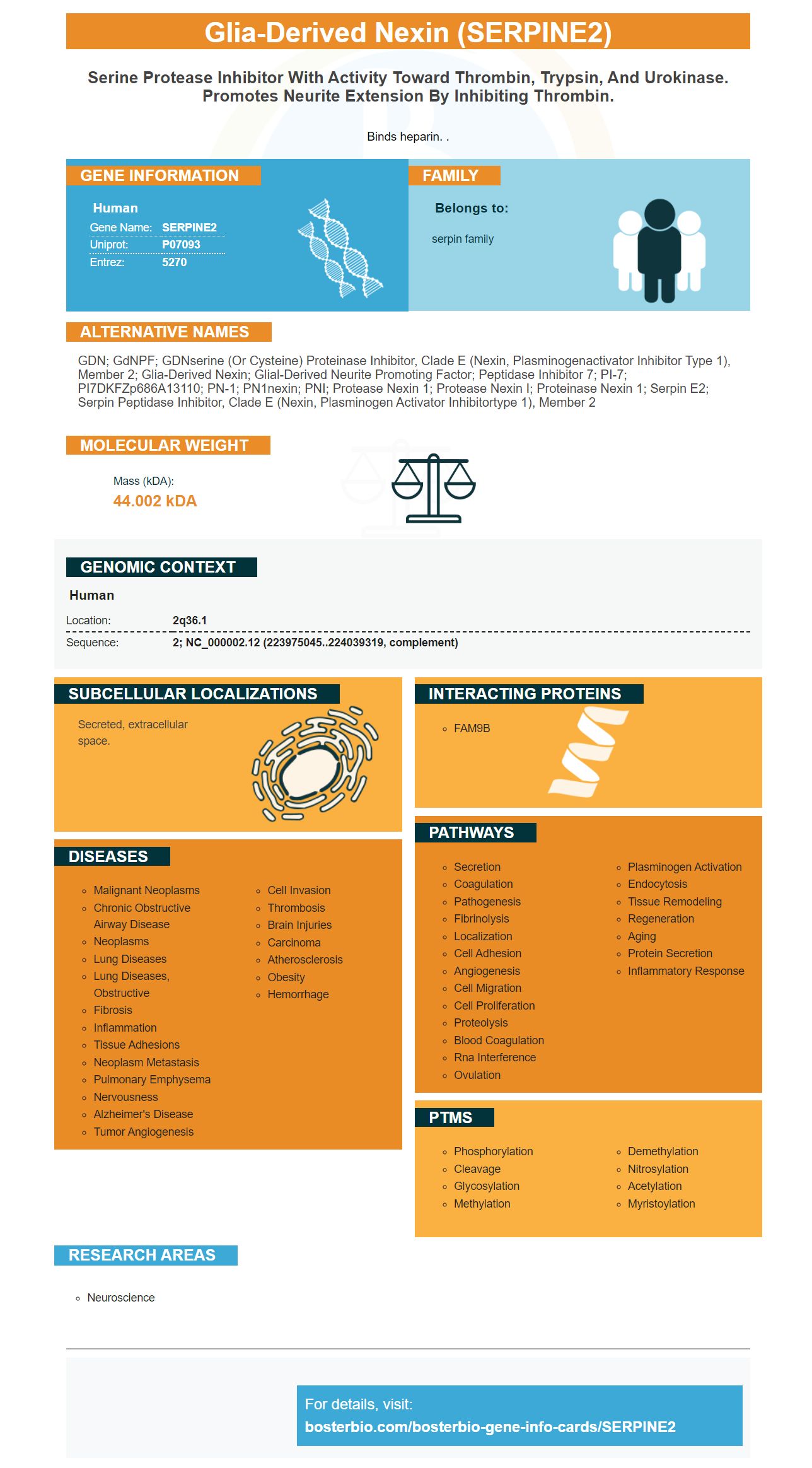 GDN; GdNPF; GDNserine (or cysteine) proteinase inhibitor, clade E (nexin, plasminogenactivator inhibitor type 1), member 2; glia-derived nexin; glial-derived neurite promoting factor; Peptidase inhibitor 7; PI-7; PI7DKFZp686A13110; PN-1; PN1nexin; PNI; Protease nexin 1; Protease nexin I; Proteinase Nexin 1; Serpin E2; serpin peptidase inhibitor, clade E (nexin, plasminogen activator inhibitortype 1), member 2