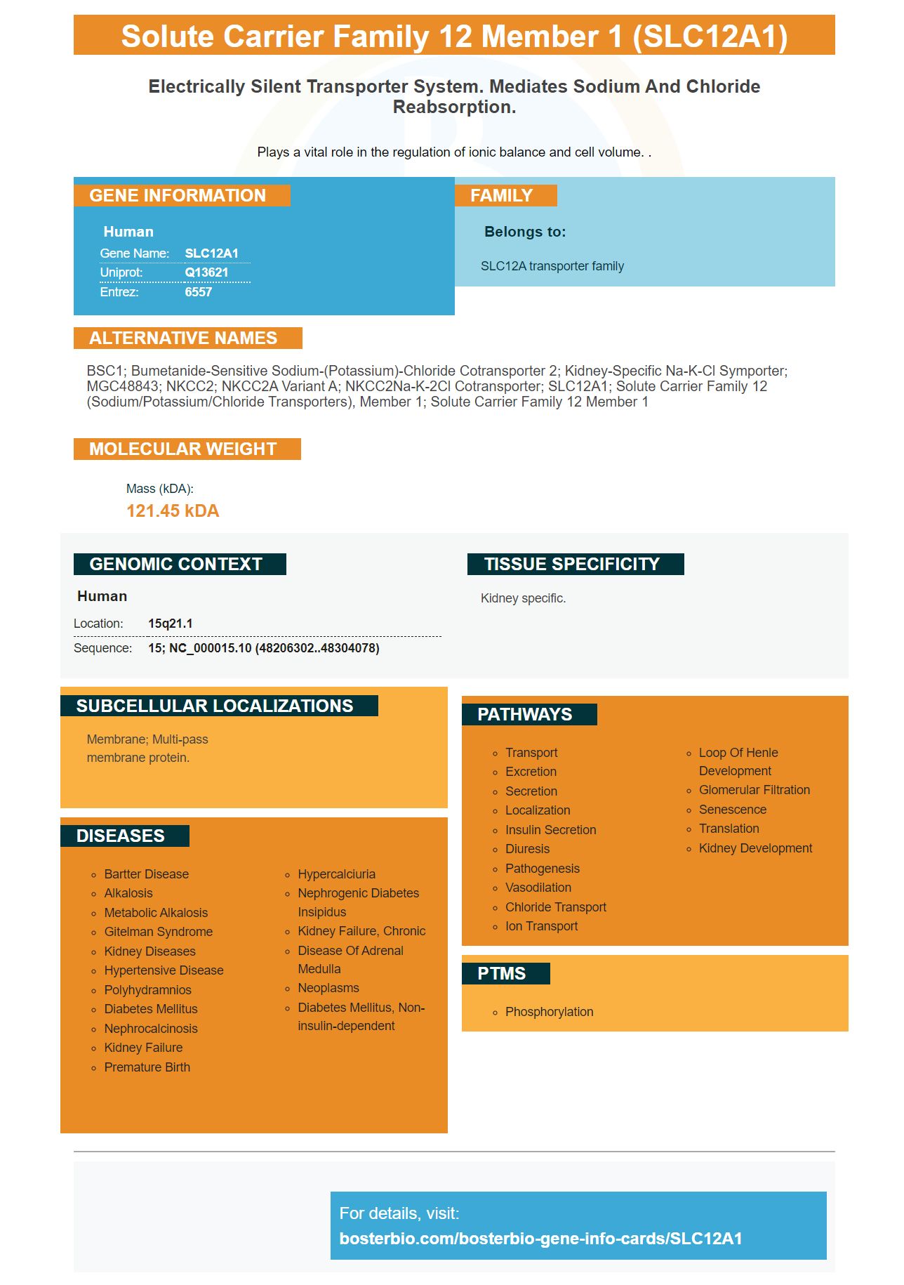 BSC1; Bumetanide-sensitive sodium-(potassium)-chloride cotransporter 2; Kidney-specific Na-K-Cl symporter; MGC48843; NKCC2; NKCC2A variant A; NKCC2Na-K-2Cl cotransporter; SLC12A1; solute carrier family 12 (sodium/potassium/chloride transporters), member 1; solute carrier family 12 member 1