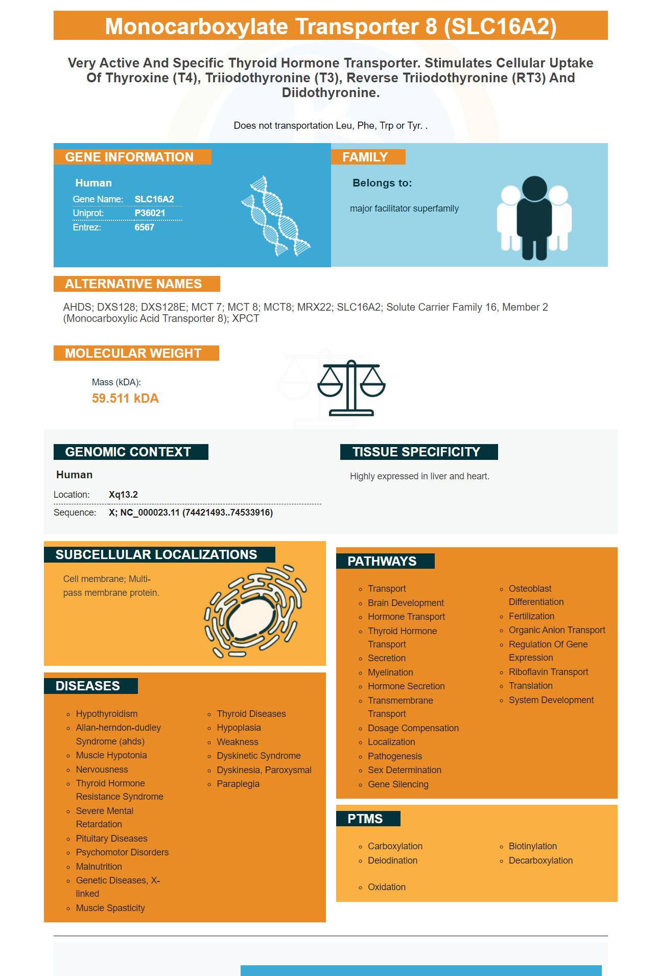 AHDS; DXS128; DXS128E; MCT 7; MCT 8; MCT8; MRX22; SLC16A2; solute carrier family 16, member 2 (monocarboxylic acid transporter 8); XPCT