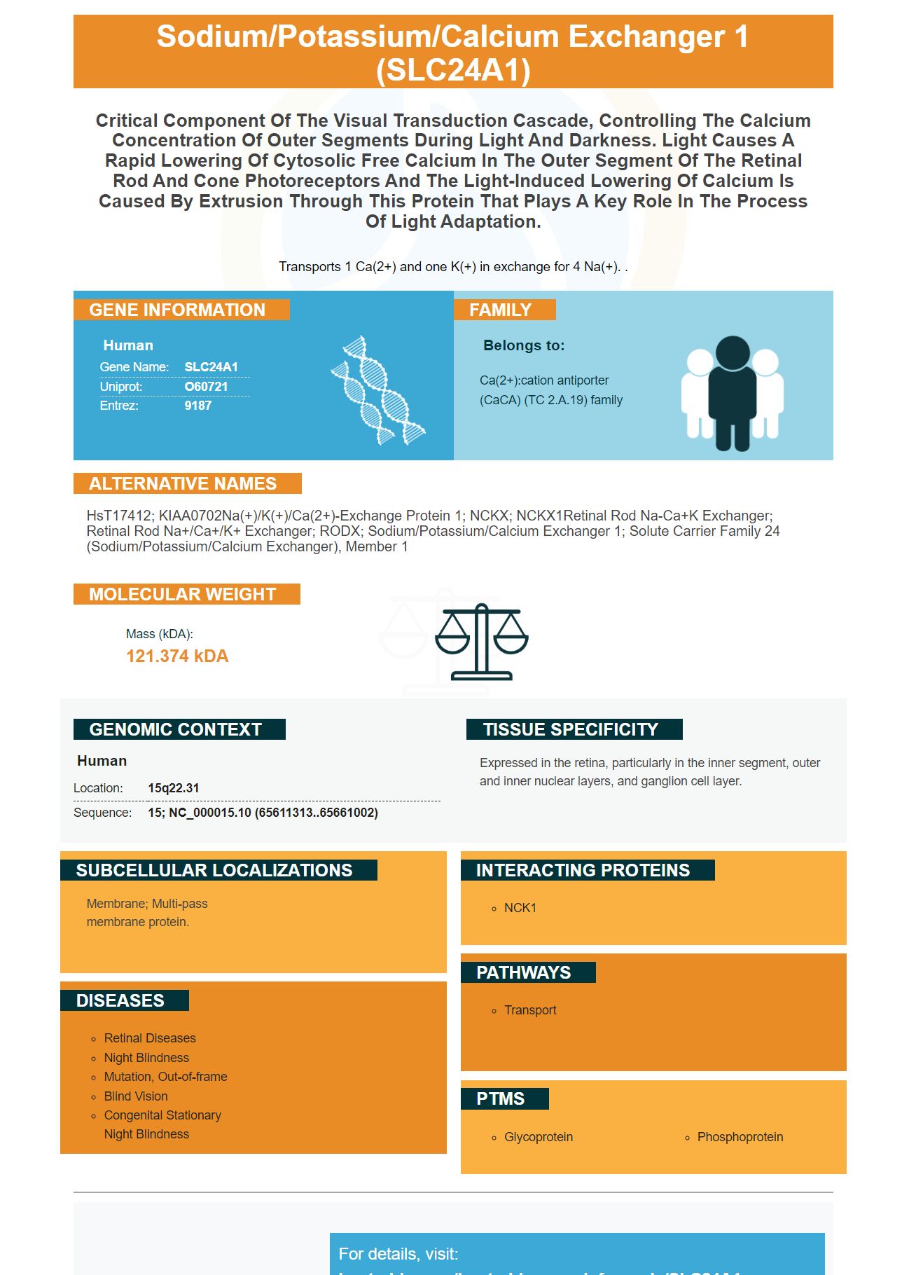 HsT17412; KIAA0702Na(+)/K(+)/Ca(2+)-exchange protein 1; NCKX; NCKX1Retinal rod Na-Ca+K exchanger; retinal rod Na+/Ca+/K+ exchanger; RODX; sodium/potassium/calcium exchanger 1; solute carrier family 24 (sodium/potassium/calcium exchanger), member 1