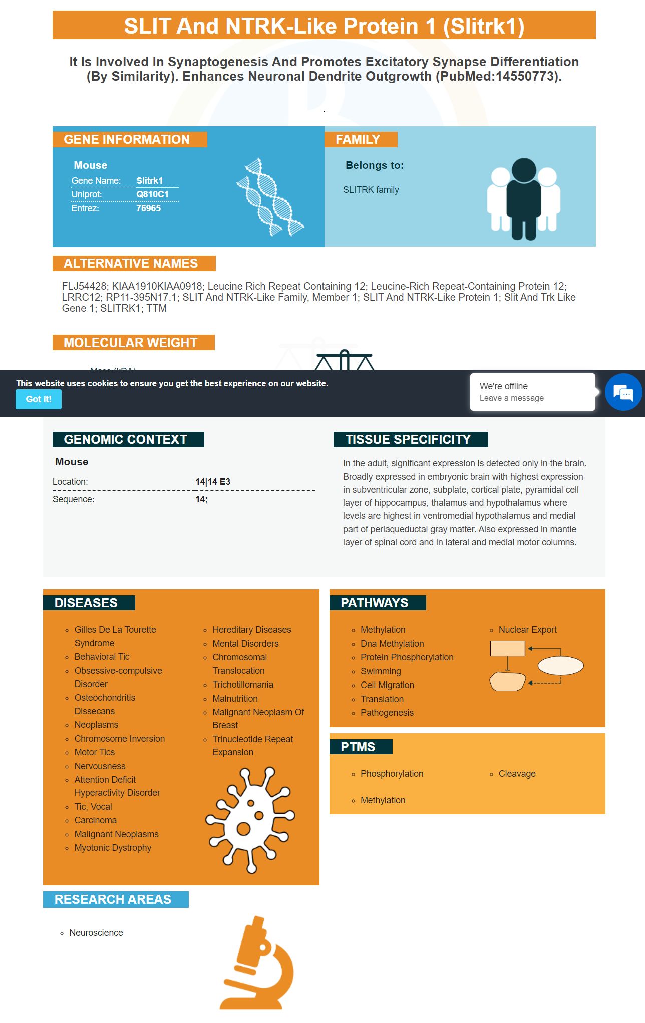 FLJ54428; KIAA1910KIAA0918; leucine rich repeat containing 12; Leucine-rich repeat-containing protein 12; LRRC12; RP11-395N17.1; SLIT and NTRK-like family, member 1; SLIT and NTRK-like protein 1; slit and trk like gene 1; SLITRK1; TTM