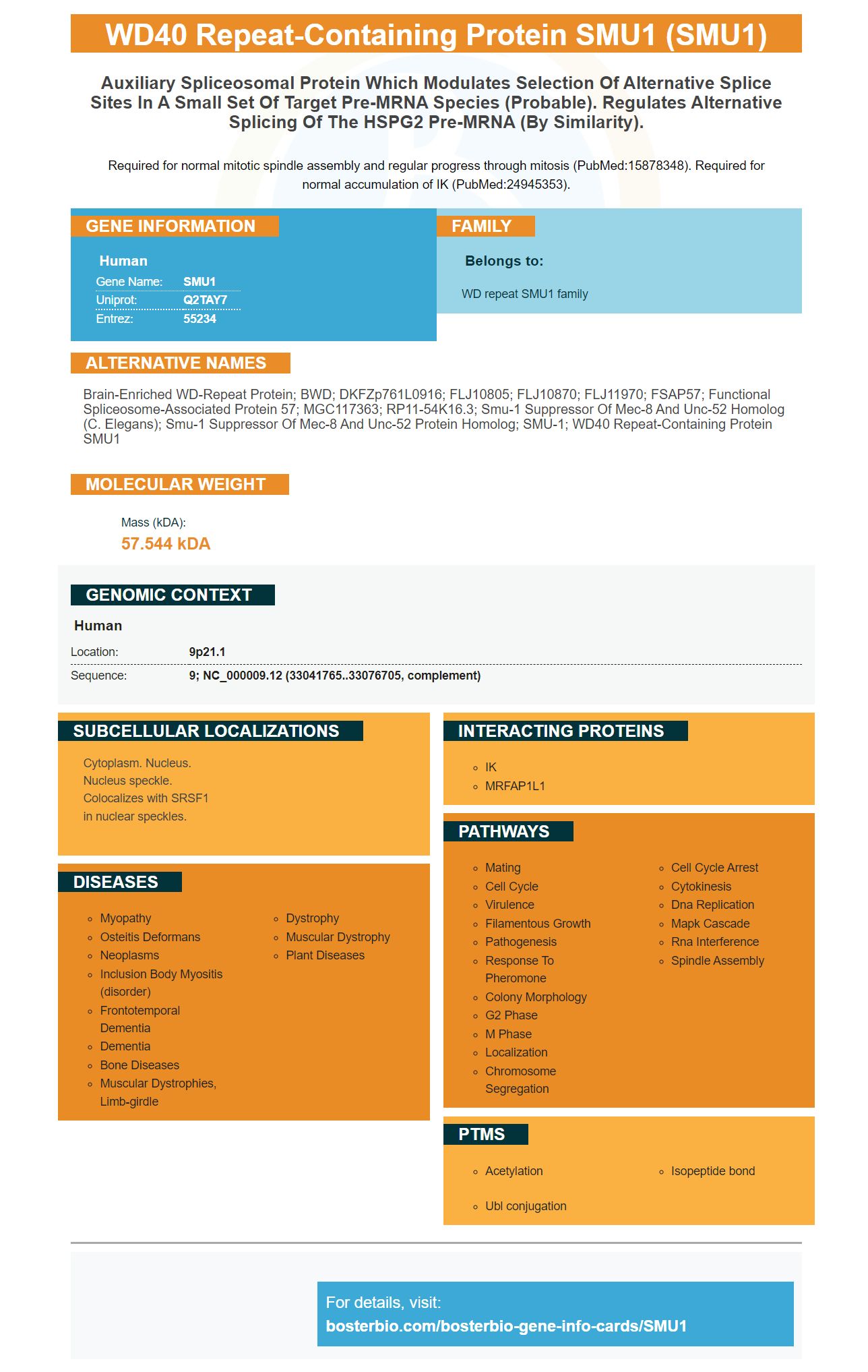brain-enriched WD-repeat protein; BWD; DKFZp761L0916; FLJ10805; FLJ10870; FLJ11970; fSAP57; functional spliceosome-associated protein 57; MGC117363; RP11-54K16.3; smu-1 suppressor of mec-8 and unc-52 homolog (C. elegans); Smu-1 suppressor of mec-8 and unc-52 protein homolog; SMU-1; WD40 repeat-containing protein SMU1