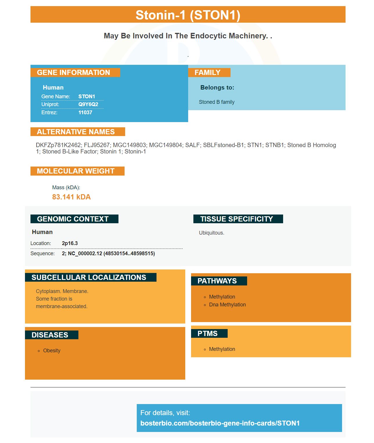 DKFZp781K2462; FLJ95267; MGC149803; MGC149804; SALF; SBLFstoned-b1; STN1; STNB1; stoned B homolog 1; Stoned B-like factor; stonin 1; stonin-1