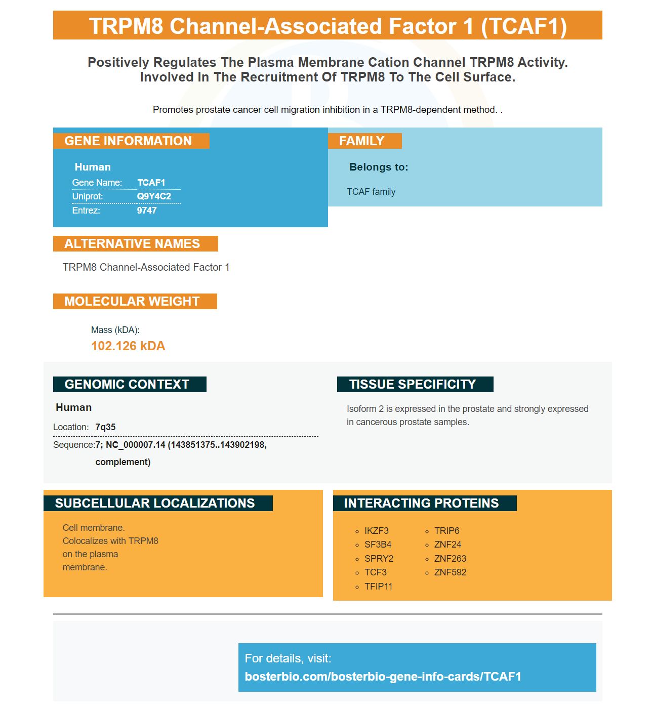 PMID: 25559186 by Gkika D., et al. TRP channel-associated factors are a novel protein family that regulates TRPM8 trafficking and activity.