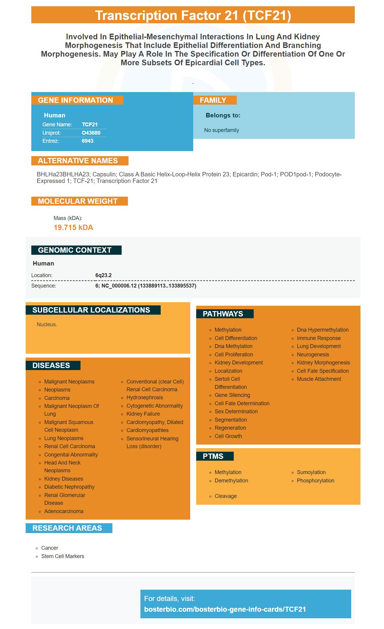 bHLHa23BHLHA23; Capsulin; Class A basic helix-loop-helix protein 23; epicardin; Pod-1; POD1pod-1; Podocyte-expressed 1; TCF-21; transcription factor 21