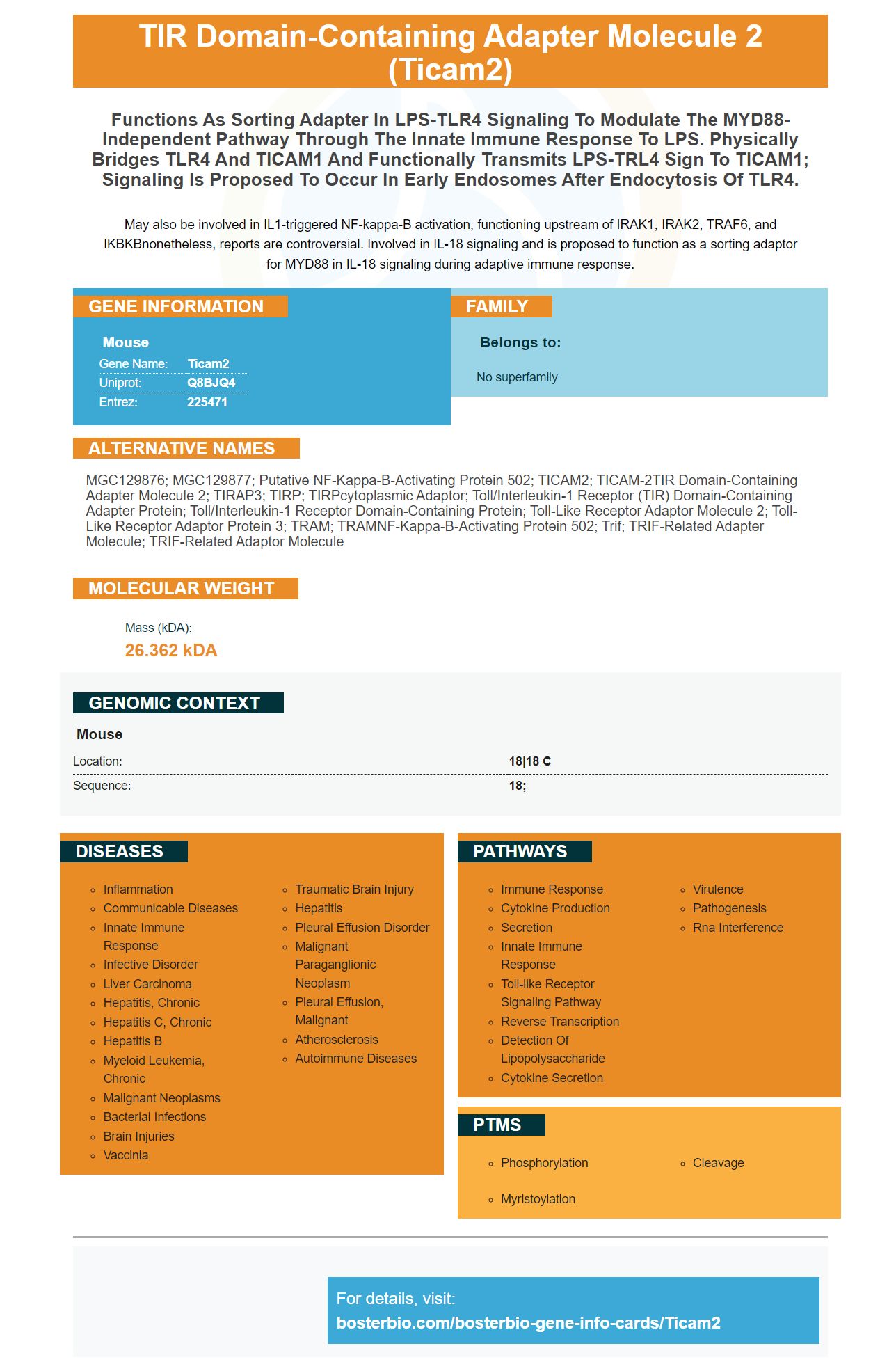 MGC129876; MGC129877; Putative NF-kappa-B-activating protein 502; TICAM2; TICAM-2TIR domain-containing adapter molecule 2; TIRAP3; TIRP; TIRPcytoplasmic adaptor; toll/interleukin-1 receptor (TIR) domain-containing adapter protein; Toll/interleukin-1 receptor domain-containing protein; toll-like receptor adaptor molecule 2; Toll-like receptor adaptor protein 3; TRAM; TRAMNF-kappa-B-activating protein 502; Trif; TRIF-related adapter molecule; TRIF-related adaptor molecule
