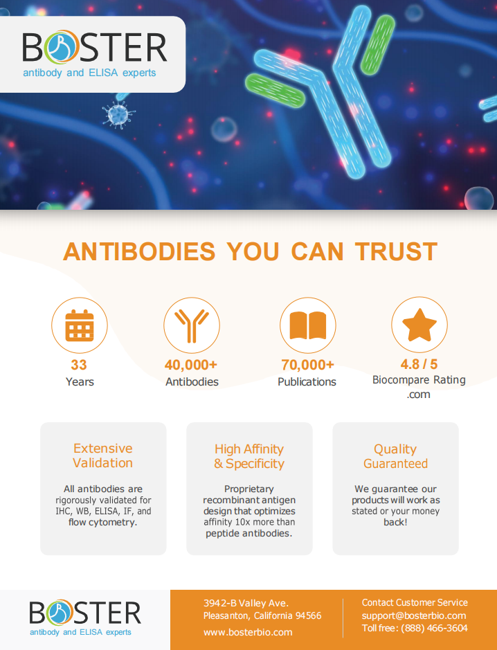 Boster Bio offers over 16,000 antibodies that have been validated for IHC, WB, ELISA, and FC in human, mouse, and rat samples. Rabbit and mouse monoclonal antibodies as well as rabbit polyclonal antibodies are available. Buy a primary antibody and get a secondary antibody for free!