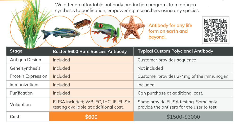 Boster Bio offers a special $600 custom rabbit polyclonal antibody production package for customers who need custom antibodies for rare species (zebrafish, drosophila, yeast, arabidopsis, C. elegans, etc.). Why $600? Because we want all researchers who need antibodies to be able to afford them.